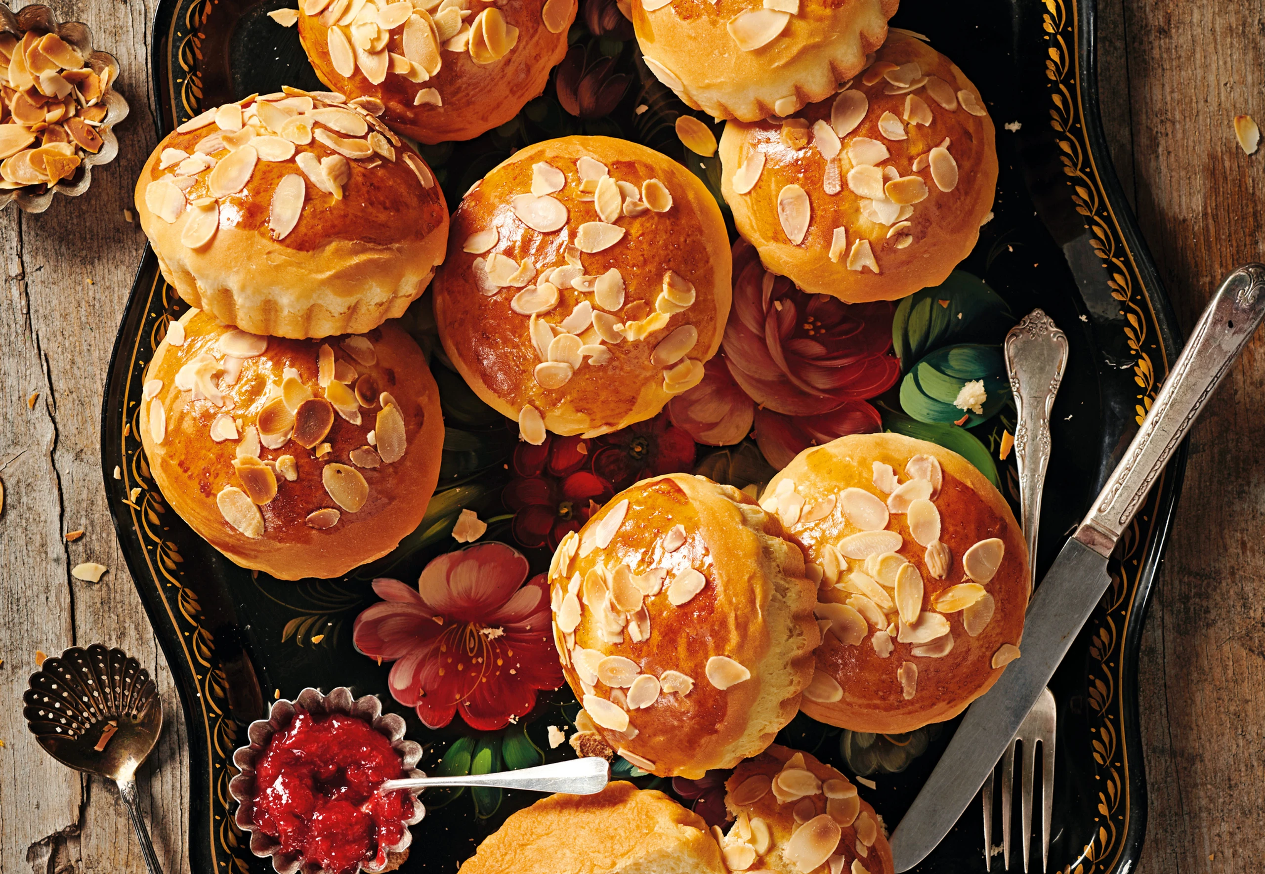 Rohr auf 180°C vorheizen. Brioches vorsichtig mit Ei bestreichen und mit Mandelblättchen bestreuen. Brioches im Rohr (mittlere Schiene) ca. 17 Minuten goldbraun backen. Herausnehmen, abkühlen lassen und mit Marmelade servieren.