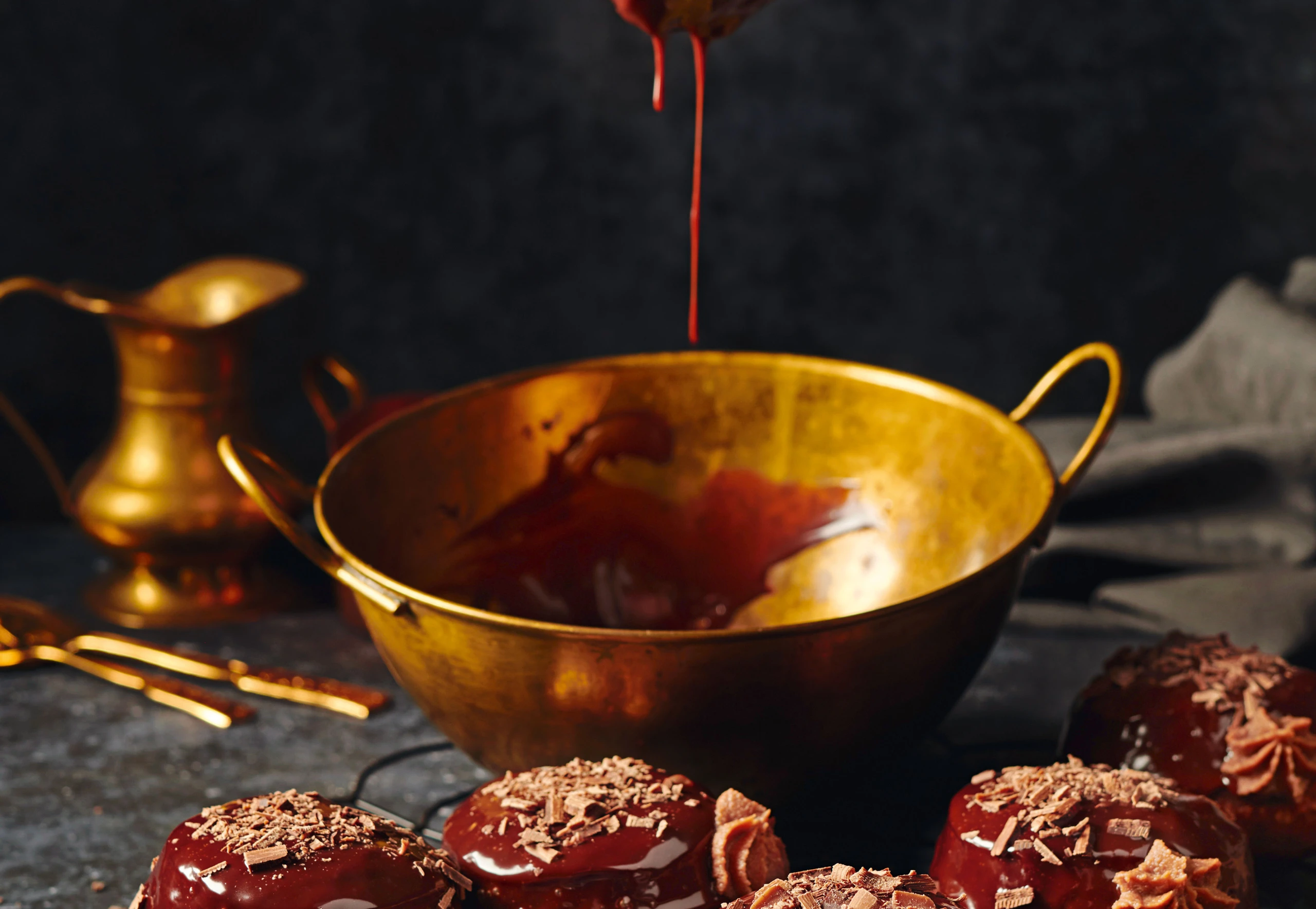 Für die Glasur Obers aufkochen und über die Kuvertüre leeren. 5 Minuten ziehen lassen, dann glatt rühren. Krapfen in die Glasur tunken und abtropfen lassen. Mit Schokoraspeln bestreuen.