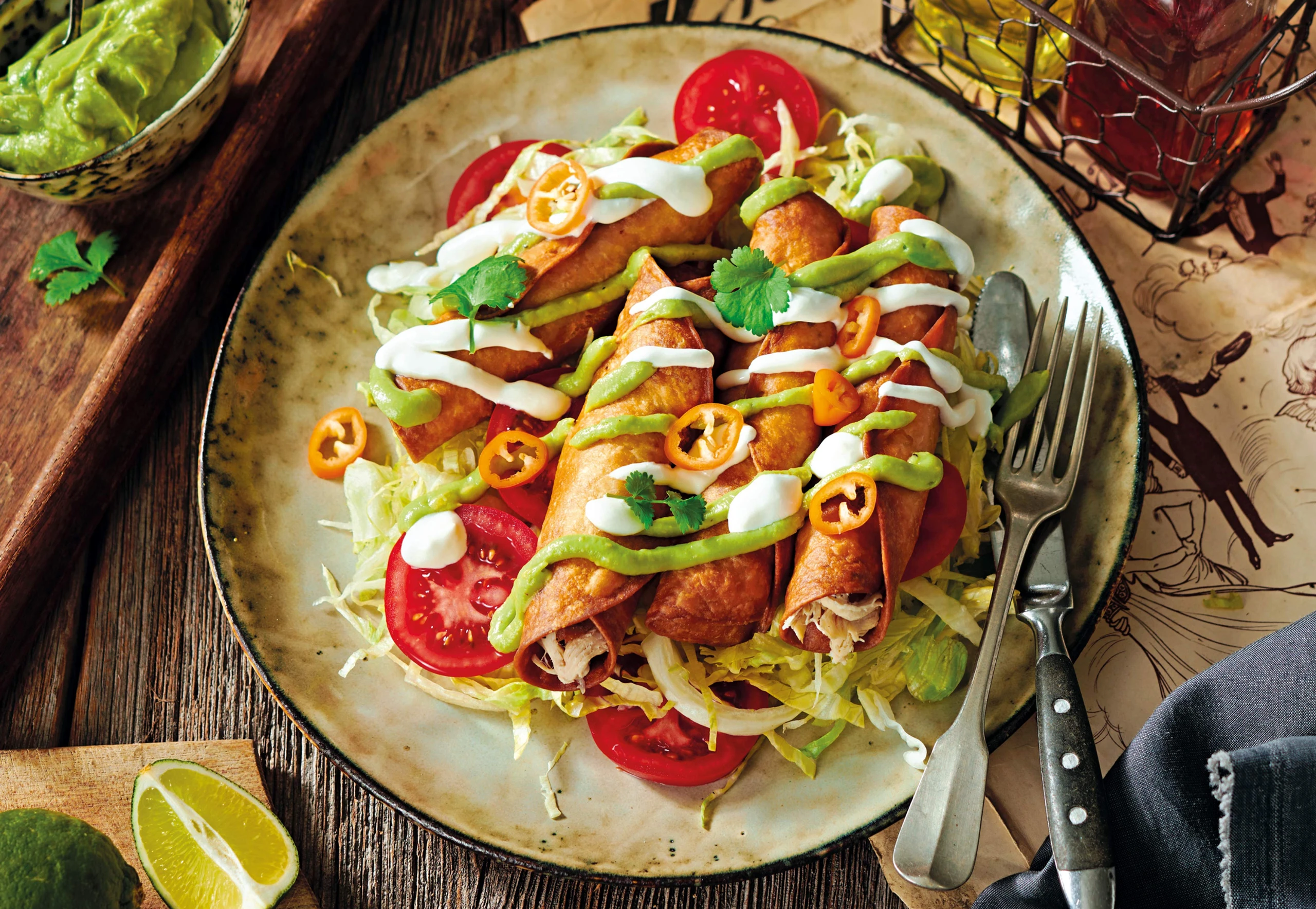 Salat fein schneiden. Paradeiser und Jalapeño in Scheiben, Limette in Spalten schneiden. Salat, Paradeiser und Jalapeño auf Tellern anrichten, Flautas de Pollo darauf legen. Avocadocreme und Sauerrahm darauf verteilen. Mit Koriander bestreuen und mit Limettenspalten servieren.