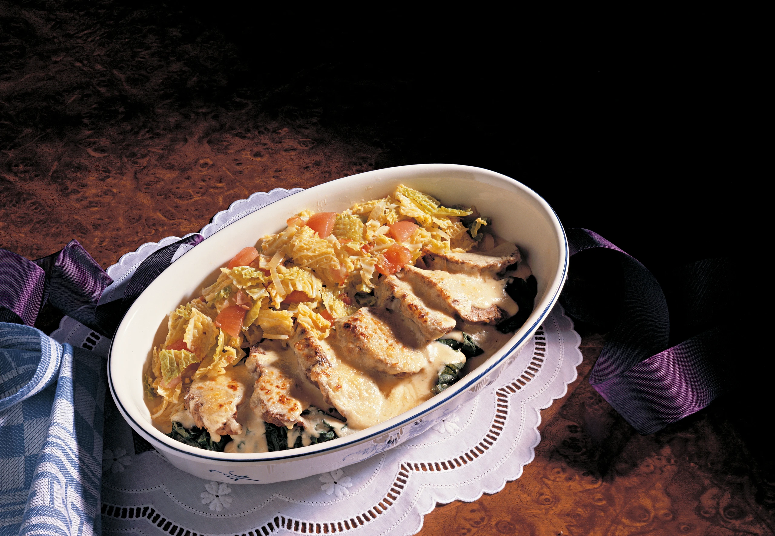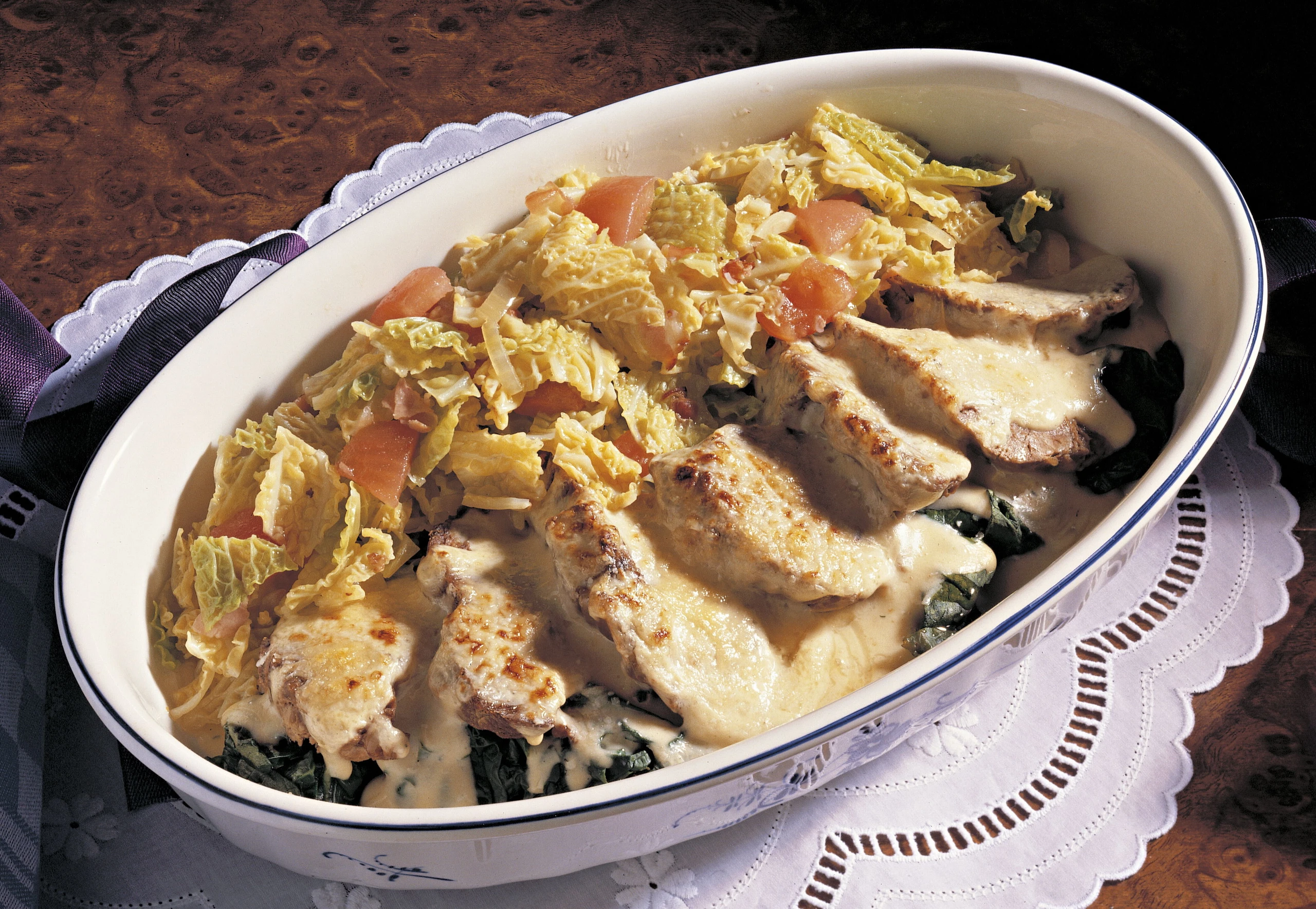 Paradeiswürfel unter den Kohl rühren. Die gratinierte Fledermaus mit Kohl servieren.