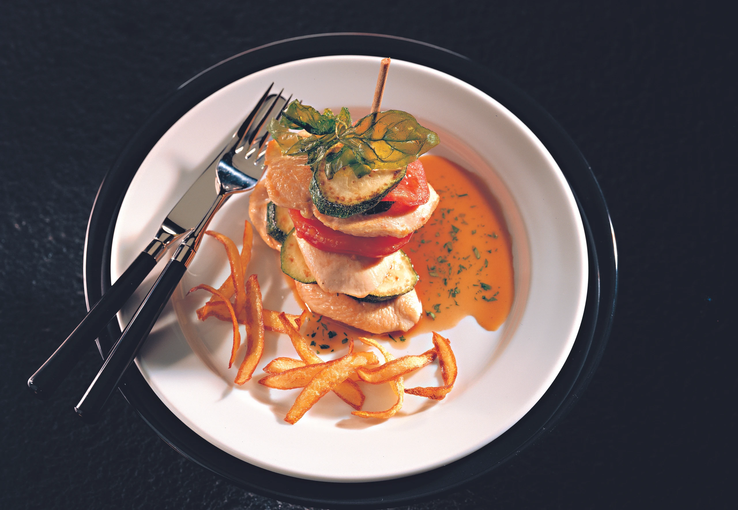 Hühnerbrüste aus dem Rohr nehmen, Haut abziehen und die Fleischstücke in je drei schräge Scheiben schneiden. Jeweils die Hälfte von Fleisch und Gemüse abwechselnd übereinandersetzen und mit einem Holzspieß fixieren. Die Türmchen mit der Sauce auf Tellern anrichten und mit der Beilage (siehe Rezept) servieren.