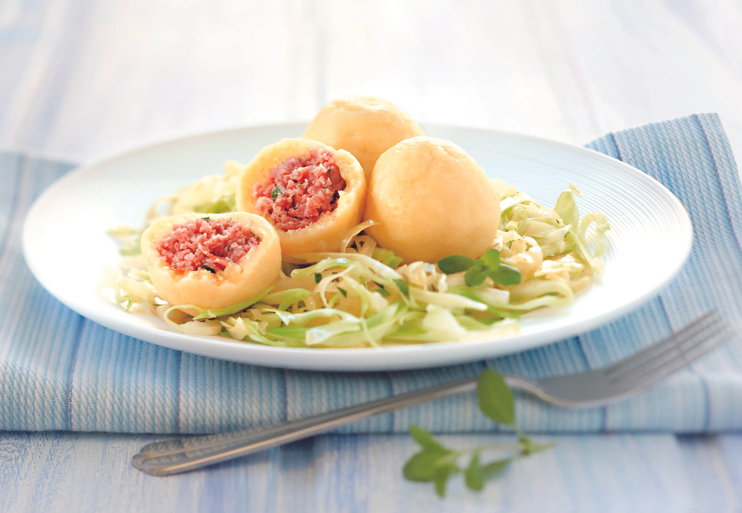 - Salzwasser aufkochen, Knödel einlegen und 12 Minuten köcheln. Knödel herausheben, abtropfen lassen und mit dem Krautsalat anrichten.