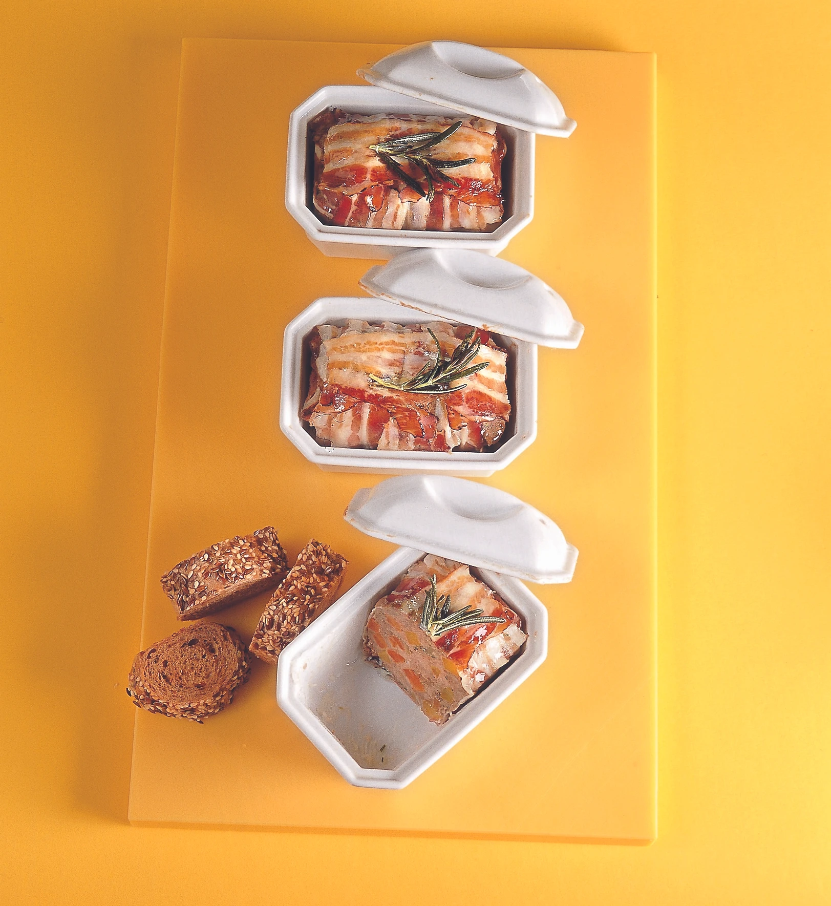 Terrinenformen am besten aus Keramik (Inhalt ca. 200 ml, mit Deckel) vorbereiten.