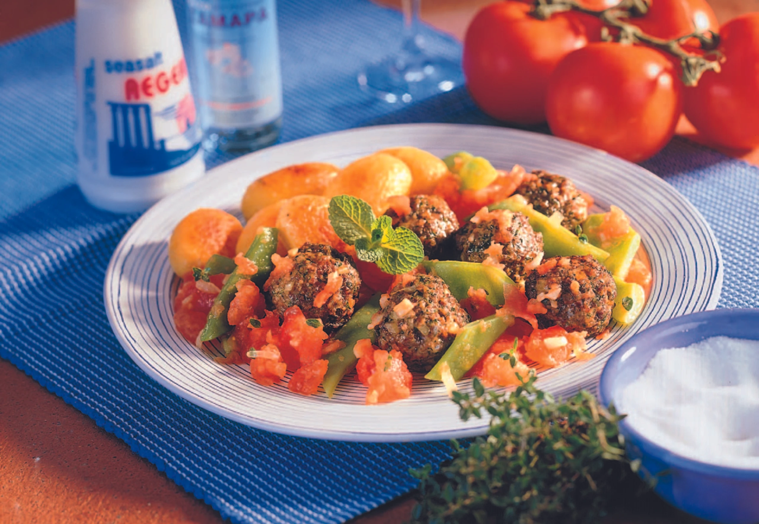 Fleischbällchen und Fisolen mit der Paradeissauce vermischen und zugedeckt noch 3 Minuten leicht kochen, wenn nötig salzen.