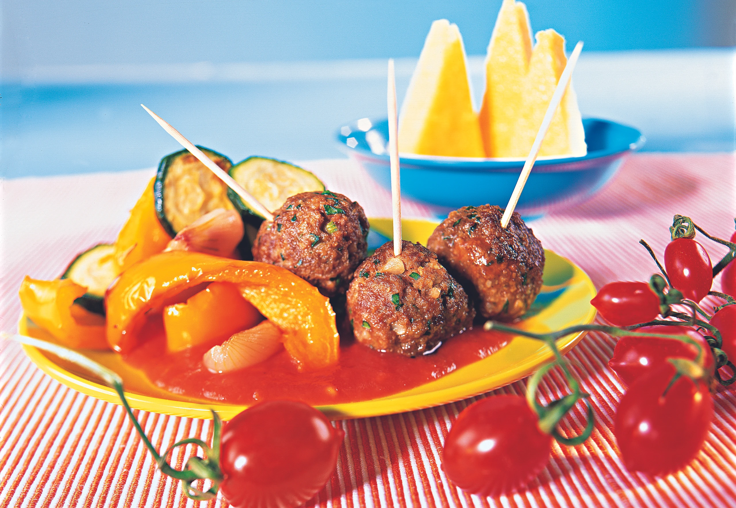 Paradeiser und Knoblauch pürieren, salzen und pfeffern. Gemüse und Fleischbällchen mit der Sauce anrichten und mit Polenta-Spitzen servieren.