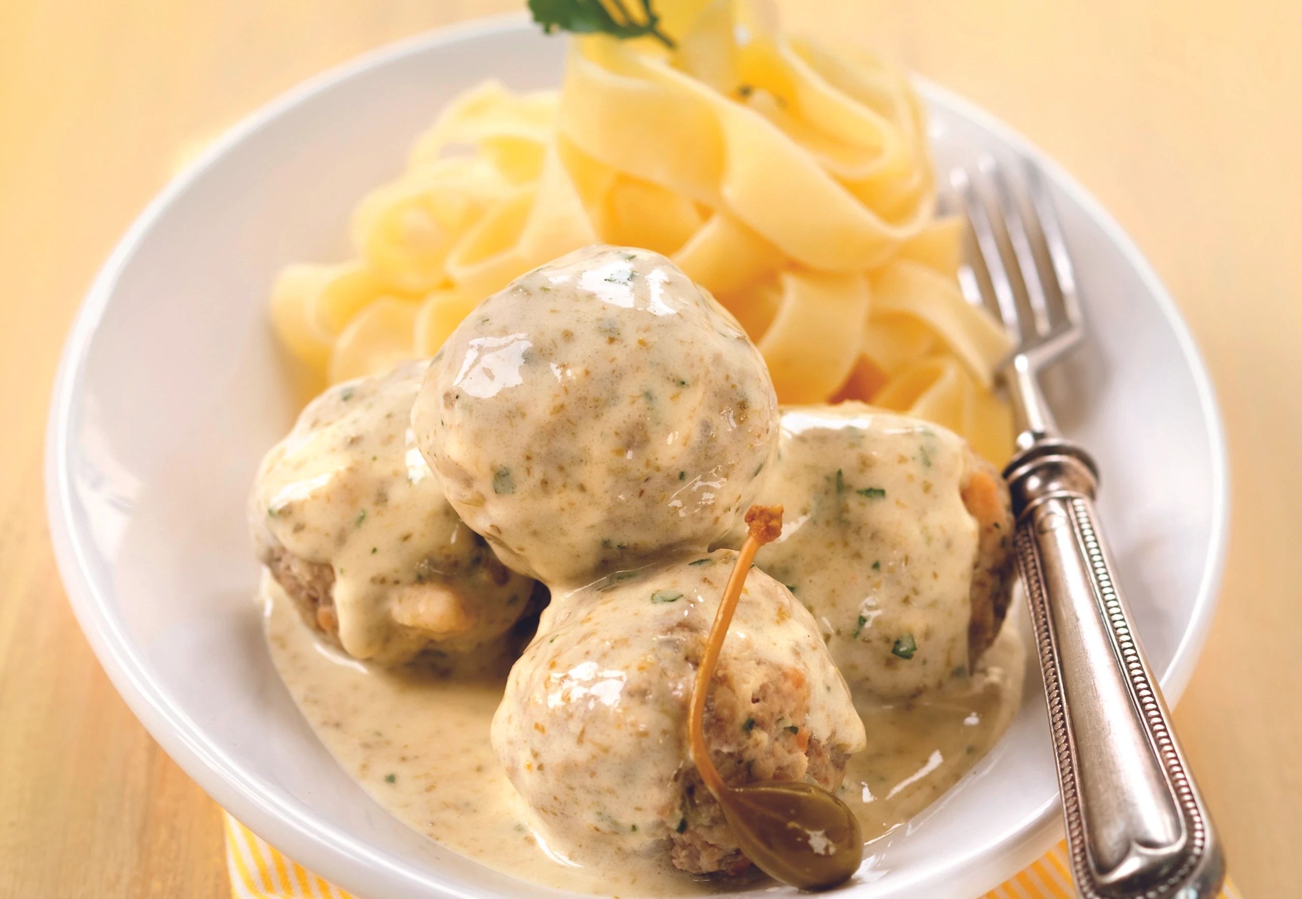 Suppe aufkochen. Bällchen einlegen und ca. 10 Minuten köcheln. Herausheben und beiseite stellen. Mehl in Butter hell anschwitzen, mit Obers und 400 ml vom Kochfond aufgießen, glatt rühren und aufkochen. Kapern zugeben. Sauce 2 Minuten köcheln, mit Salz, Pfeffer und Zitronensaft würzen und pürieren. Petersilie einrühren, Bällchen einlegen und darin erwärmen. Bällchen mit der Sauce anrichten, evtl. mit Kapern garnieren. Dazu passen Nudeln.