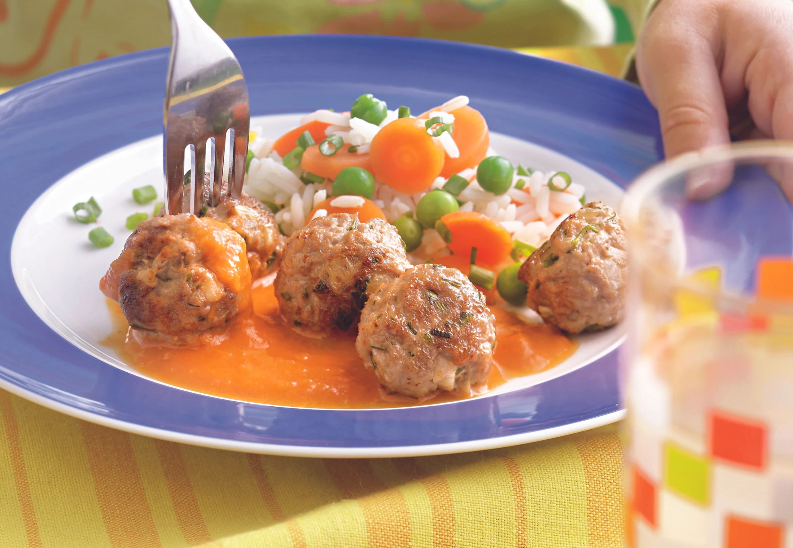 Fleischbällchen in die Sauce legen und darin ca. 5 Minuten köcheln; dabei öfter wenden. Fleischbällchen mit Sauce und Gemüsereis anrichten.