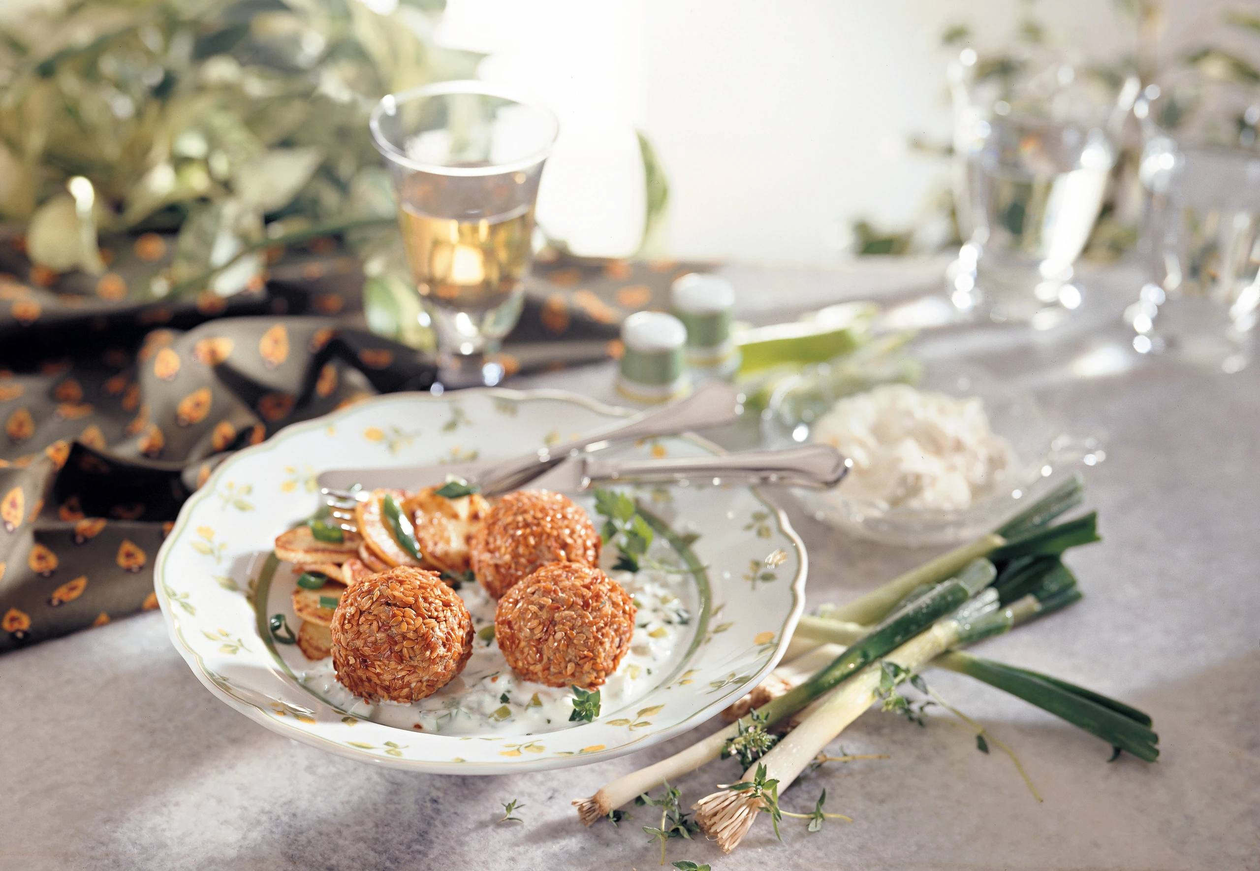 Zweites Ei verquirlen. Faschiertes zu zwölf kleinen Kugeln formen und nacheinander in Mehl, Ei und dem restlichen Leinsamen wenden.