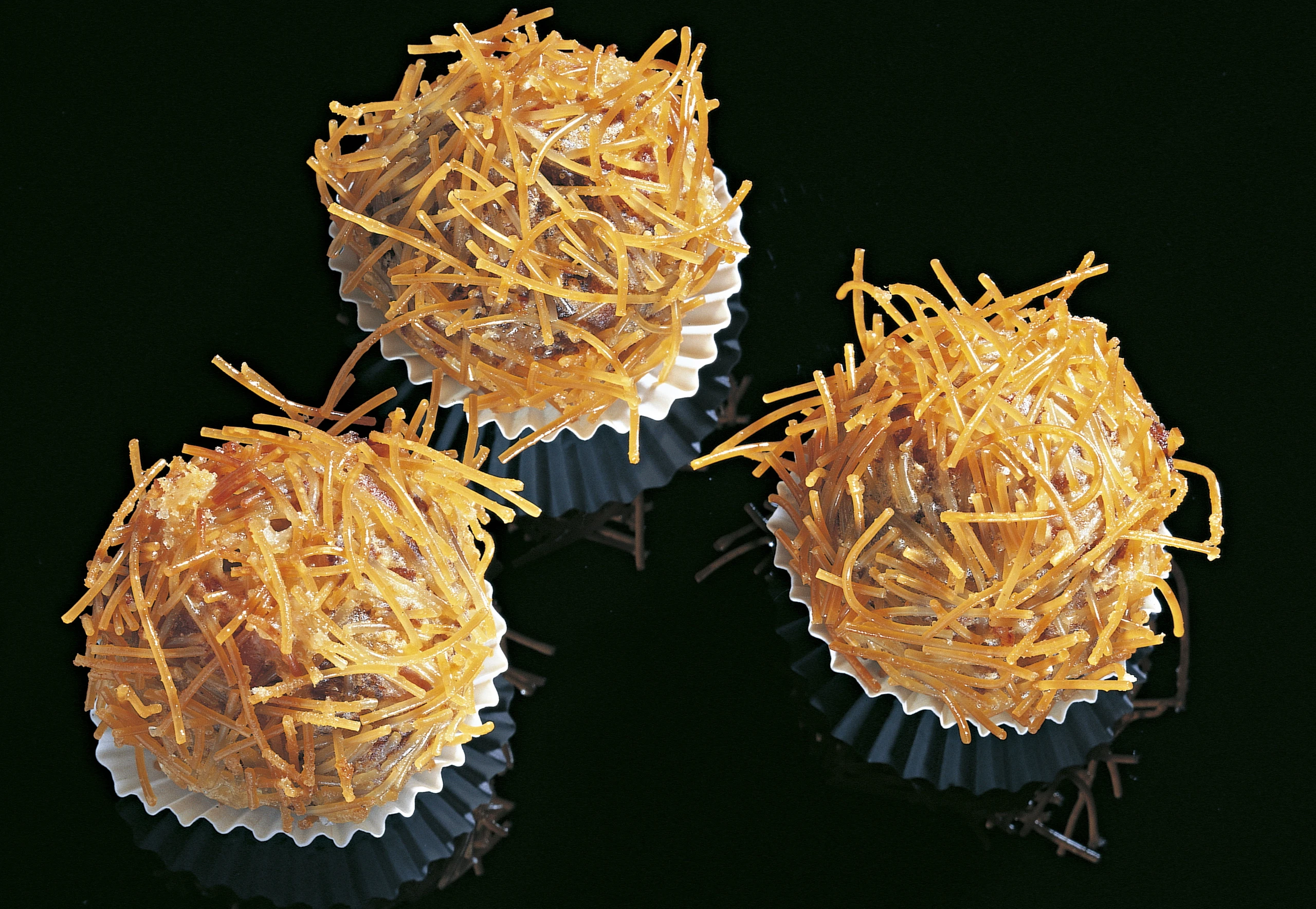 Restliche Eier verquirlen. Aus der Masse gleichgroße, glatte Kugeln formen und in Mehl, verquirltem Ei und den Nudeln wenden.