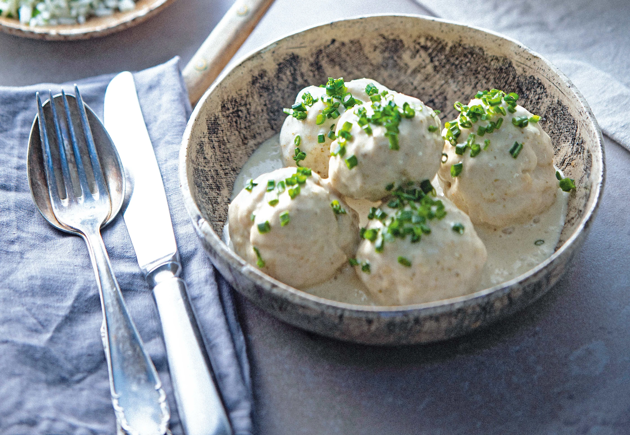 Kapern und Sardellen zugeben und die Sauce mit dem Stabmixer aufschlagen. Stärke mit einigen Tropfen Wasser mischen und in die Sauce rühren. Sauce nochmal kurz aufkochen und mit Salz, Pfeffer und Zitronensaft würzen. Bällchen in der Sauce ziehen lassen.
