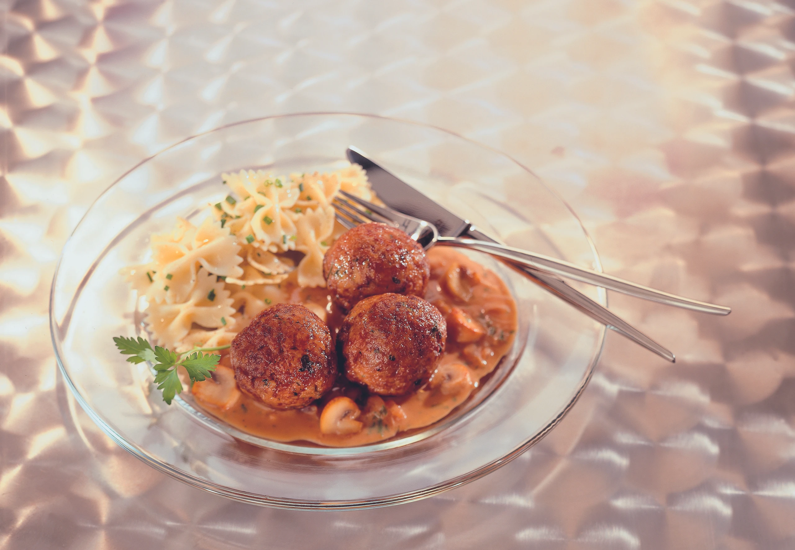 Im Bratrückstand Zwiebel und Champignons anschwitzen, mit Wein, Bratensaft und Obers ablöschen und ca. 1 Minute köcheln. Petersil einrühren. Fleischbällchen zugeben und vor dem Anrichten kurz in der Sauce ziehen lassen. Fleischbällchen mit der Sauce und den Nudeln servieren.