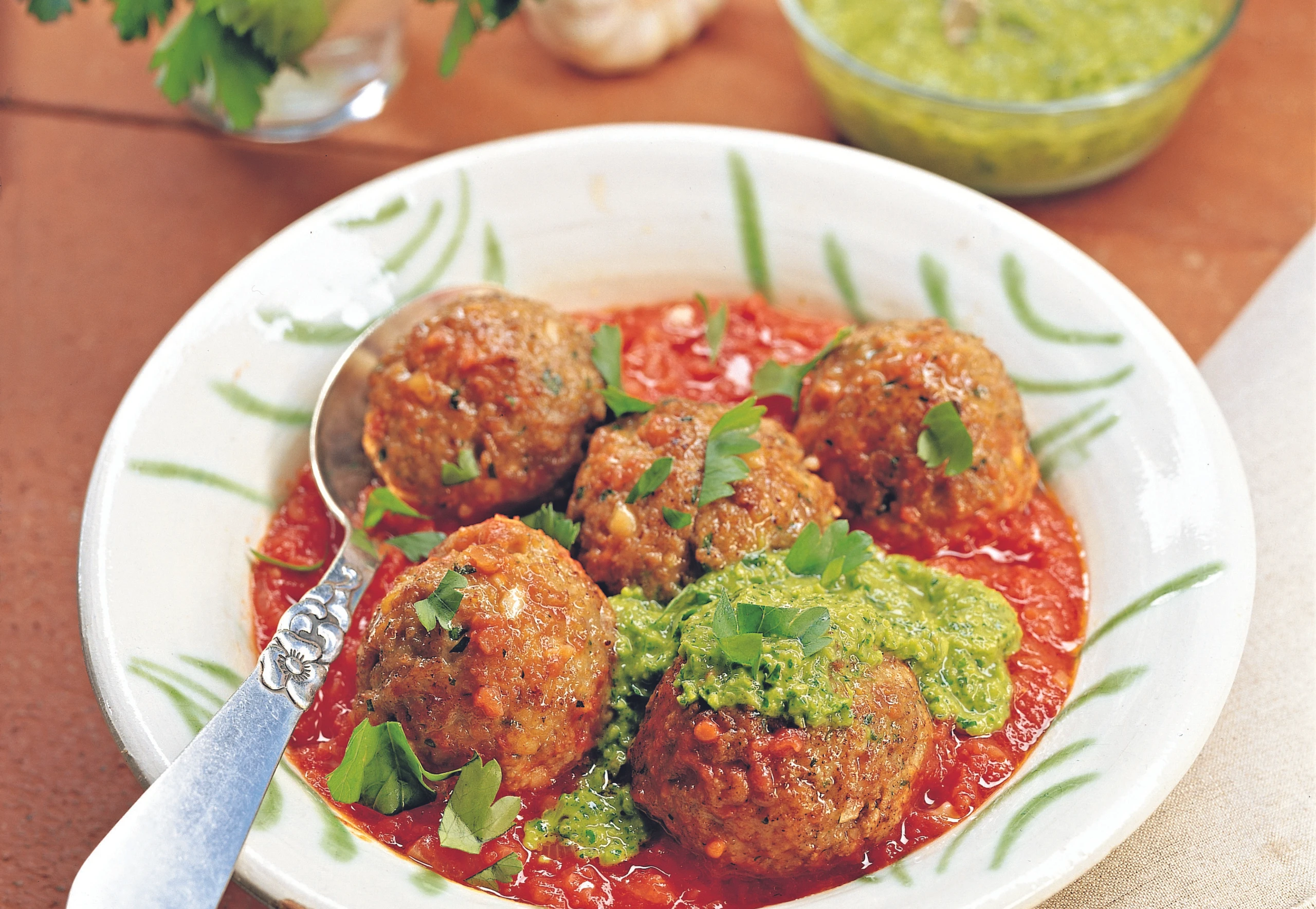 Bällchen in Mehl wenden und in wenig Öl rundum anbraten. Kurz abtropfen lassen, in die Paradeissauce geben und halb zugedeckt ca. 30 Minuten schwach köcheln. Mit der grünen Sauce und eventuell mit Petersilie garniert servieren.
