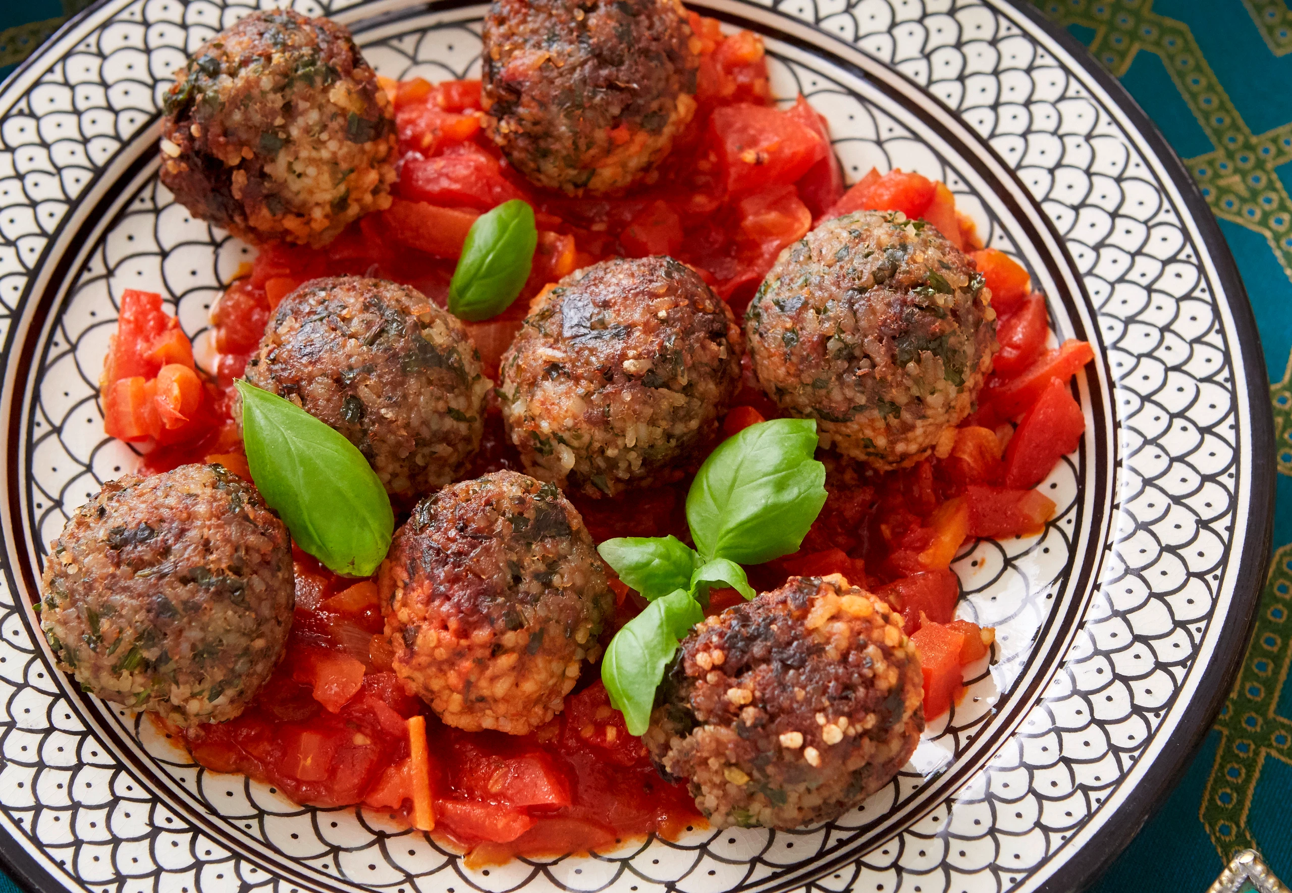 Reis abgießen und im Kutter fein zerkleinern. Petersilie fein hacken und mit den restlichen Zutaten vermischen. Masse salzen, in 32 kleine Bällchen formen und in 6 EL Öl rundum goldbraun braten.