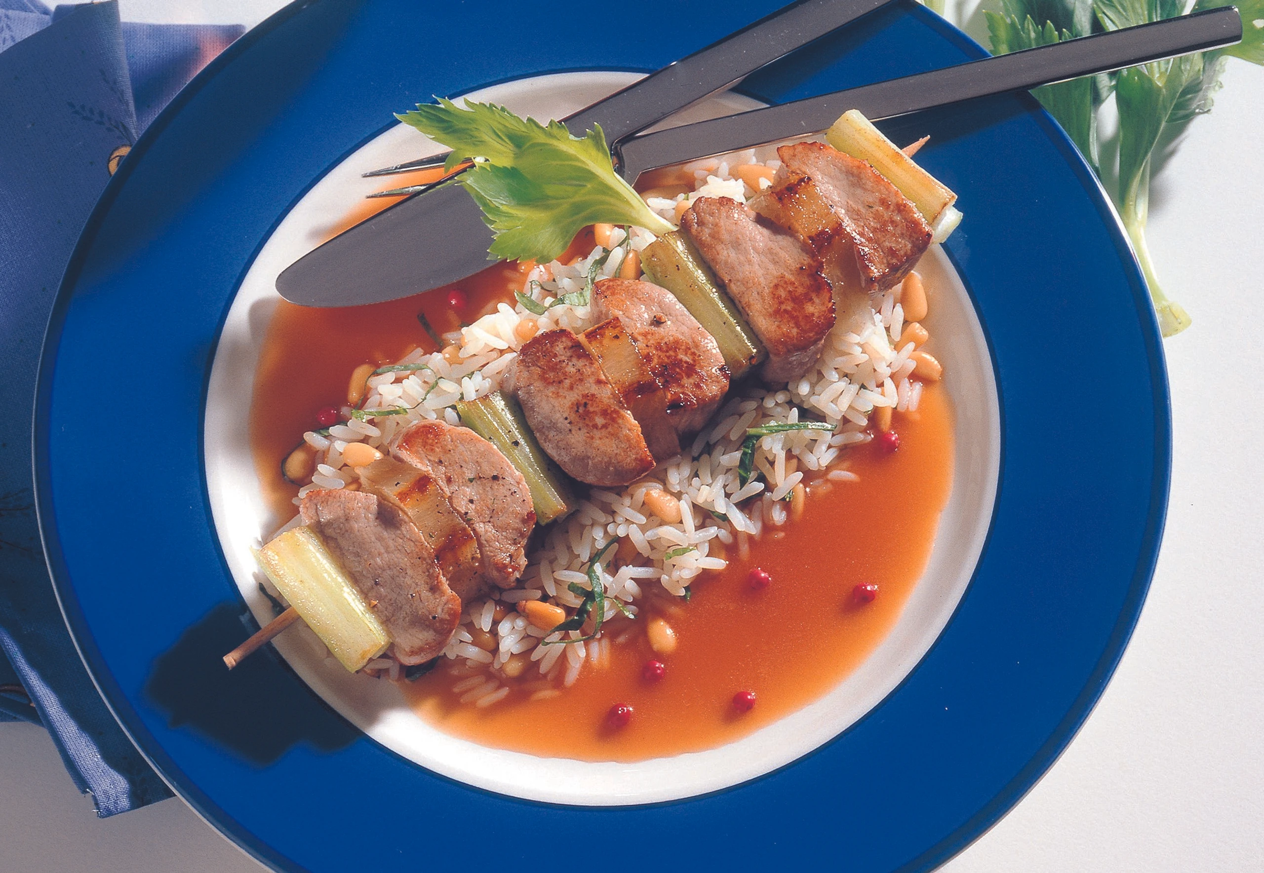 Ananas und Sellerie in etwa gleich große Stücke schneiden und abwechselnd mit dem Fleisch auf Spieße stecken. Spieße rundum mit Salz, Pfeffer und Majoran würzen. Backrohr auf 50 °C vorheizen.