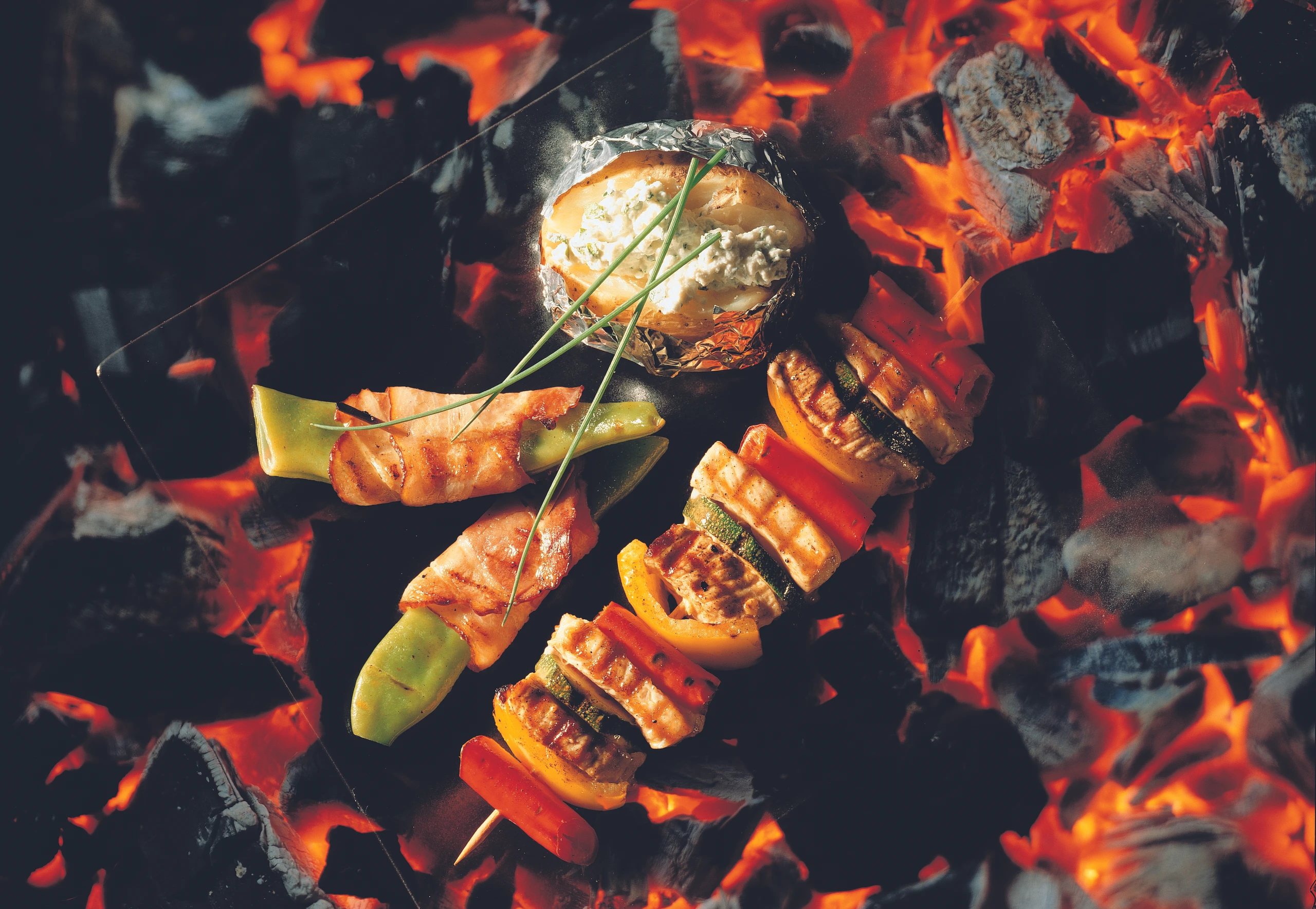 Fleisch und Gemüse abwechselnd auf Spieße stecken und mit Salz und Pfeffer würzen. Spieße mit Öl bestreichen und beidseitig grillen.
