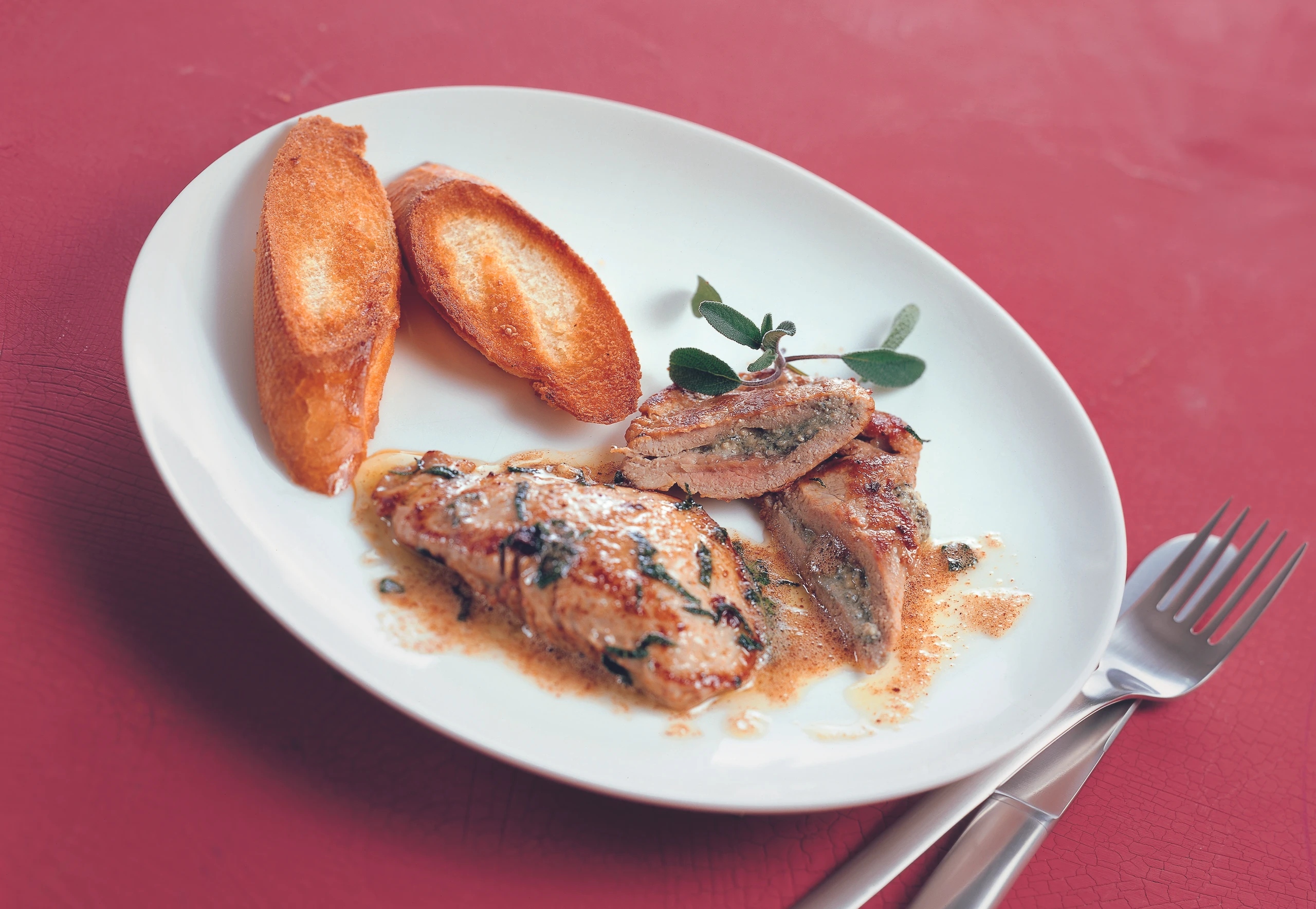 Im Bratrückstand Butter aufschäumen, Salbei zugeben, dann die Tascherl einlegen und kurz darin wenden. Tascherl mit der Salbeibutter und Baguette anrichten.