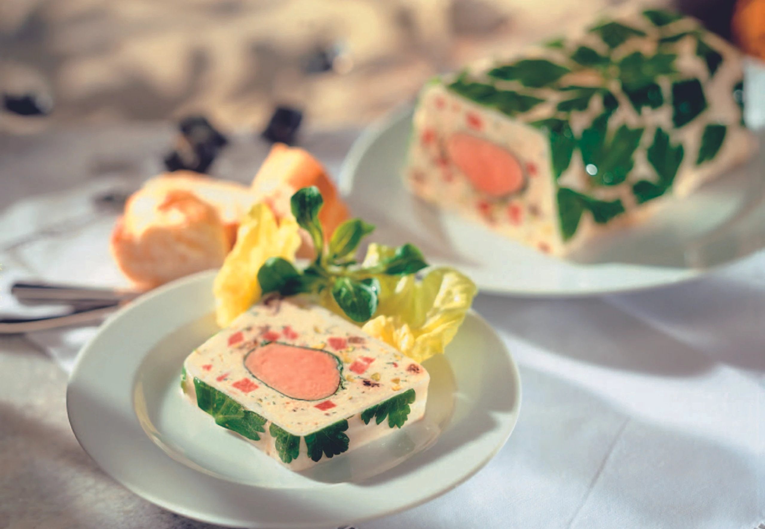Fleischterrine mit Morcheln, Zunge und Pistazien