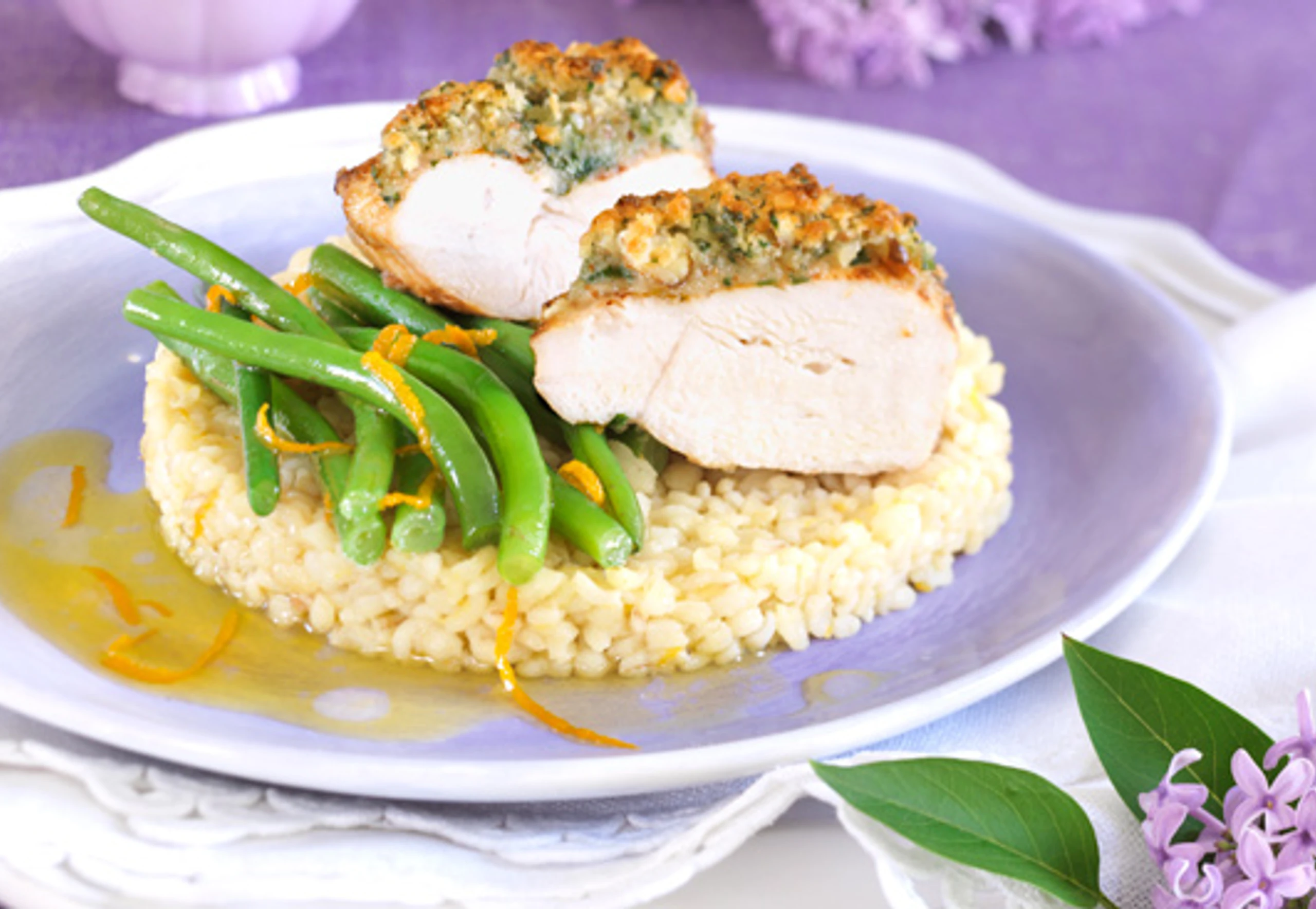 Flieder-Huhn in Mandelkruste