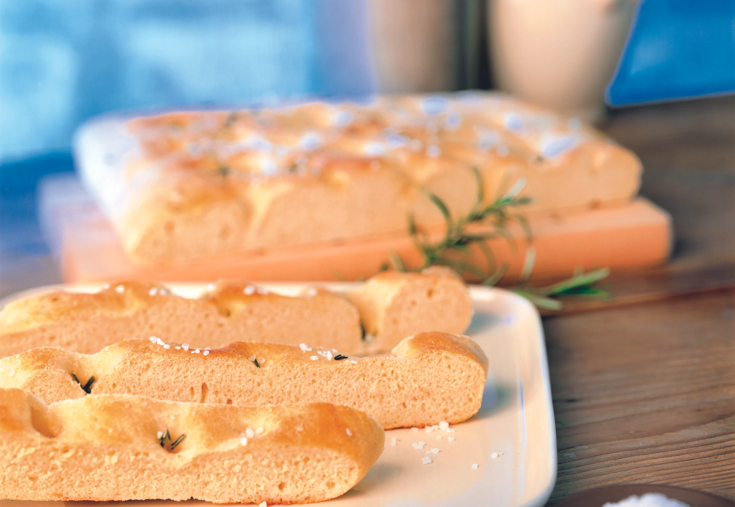 Teig auf Backblechgröße ausziehen, mit den Fingern Löcher eindrücken, auf ein mit Backpapier belegtes Blech legen, mit Rosmarin und Meersalz bestreuen und ca. 20 Minuten backen.