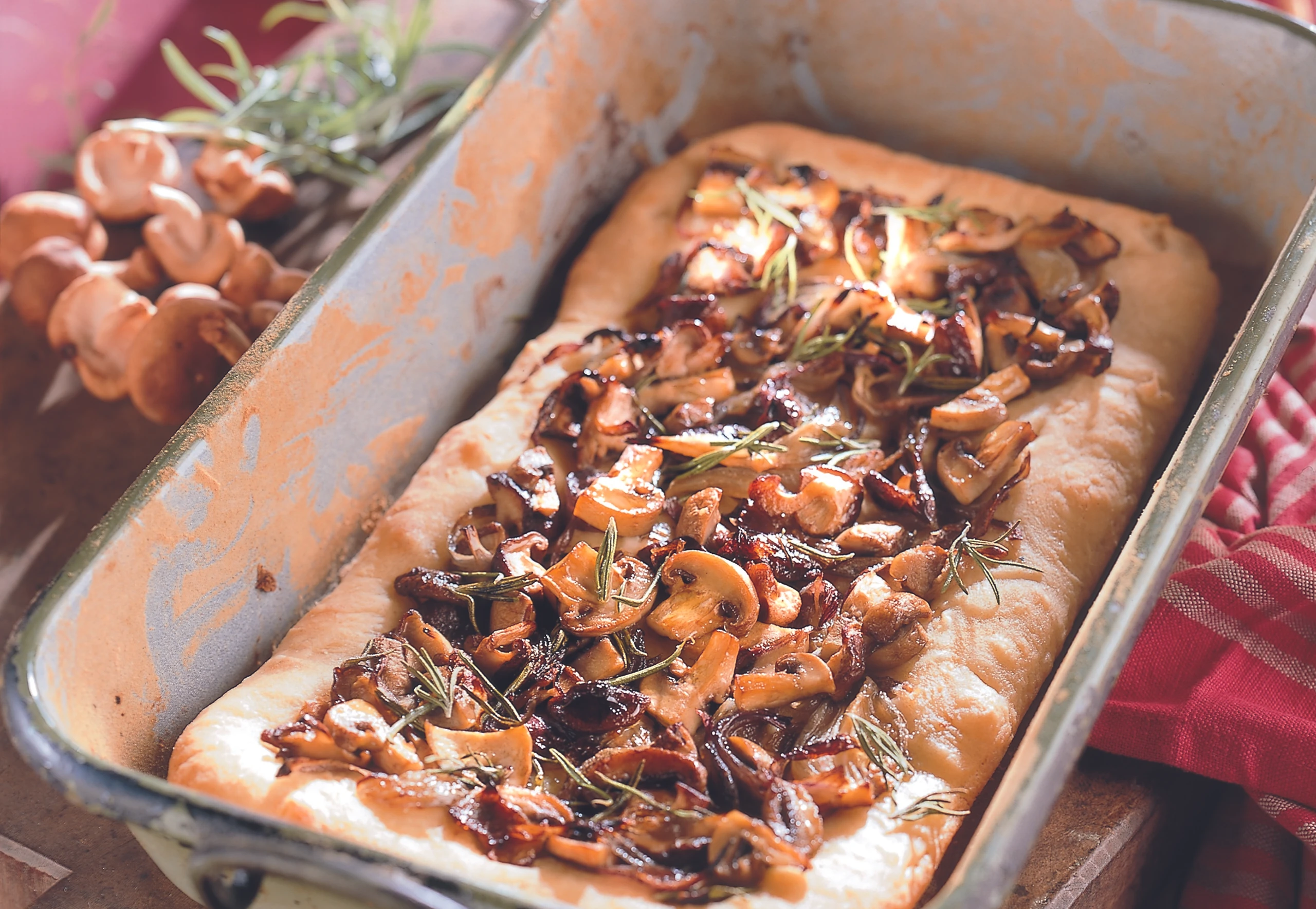 Teig im Rohr 5 Minuten anbacken, dann Pilze und Rosmarin darauf verteilen und 25–30 Minuten fertig backen. Mit Olivenöl beträufeln.