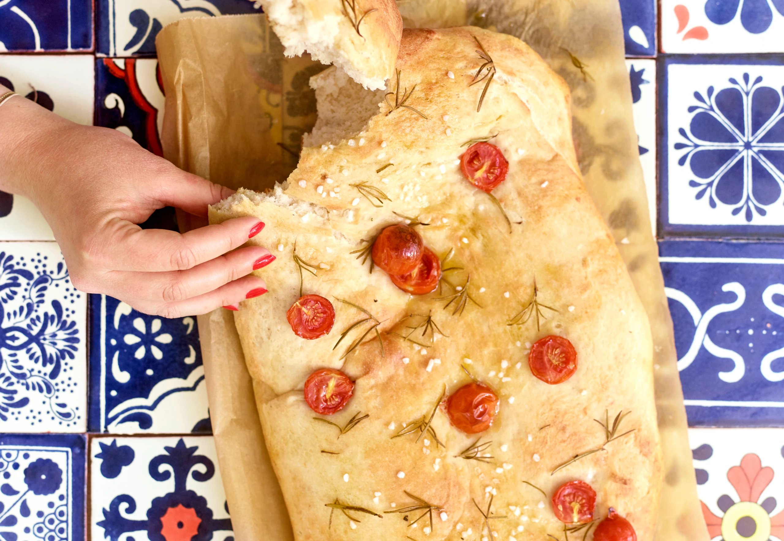 Focaccia mit Rosmarin und Paradeisern
