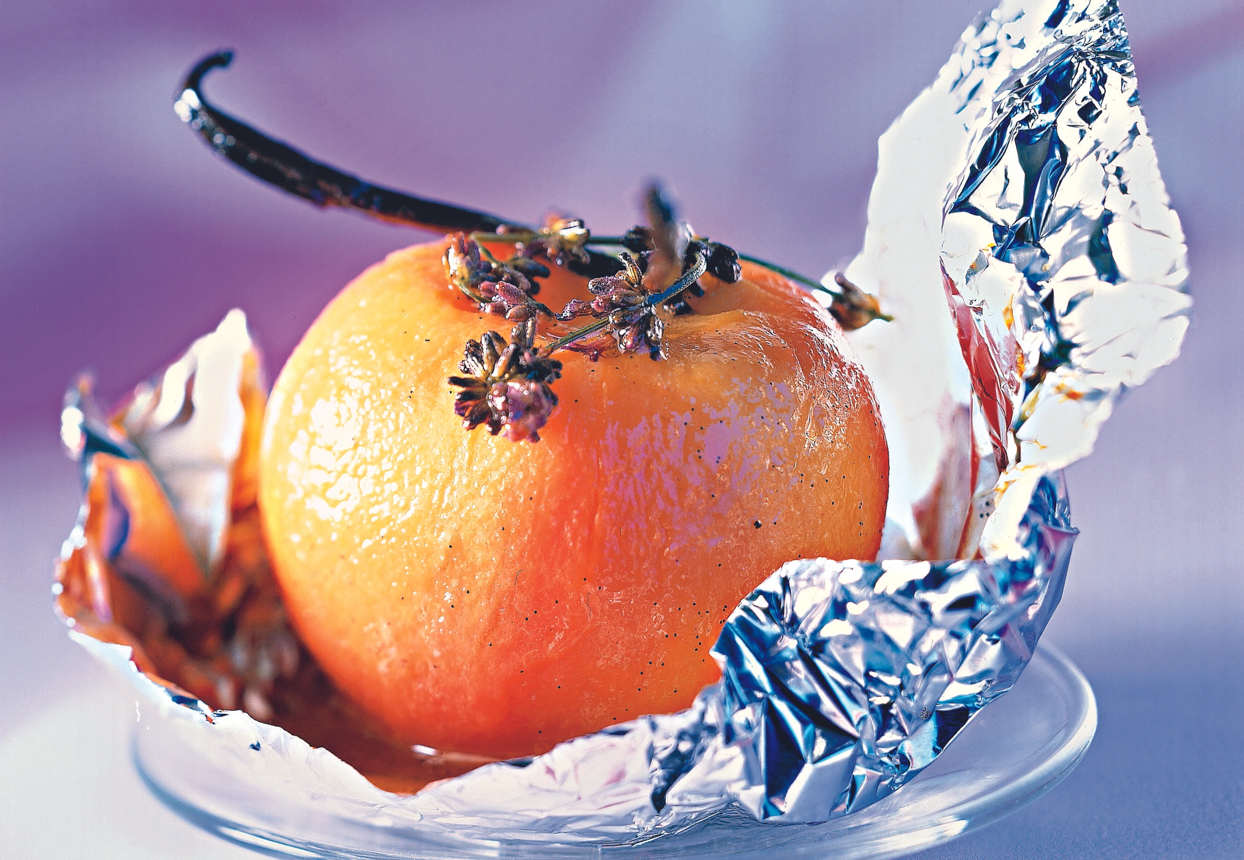 - Pfirsiche in der Marinade wenden, herausheben und auf die Folie setzen. Früchte mit der Marinade übergießen und mit Vanilleschoten und Lavendelzweigen belegen. Folienecken über die Pfirsiche zur Mitte hin hochziehen und eindrehen. Pfirsiche in die Form geben und im Rohr (untere Schiene / Gitterrost) 20 Minuten backen.