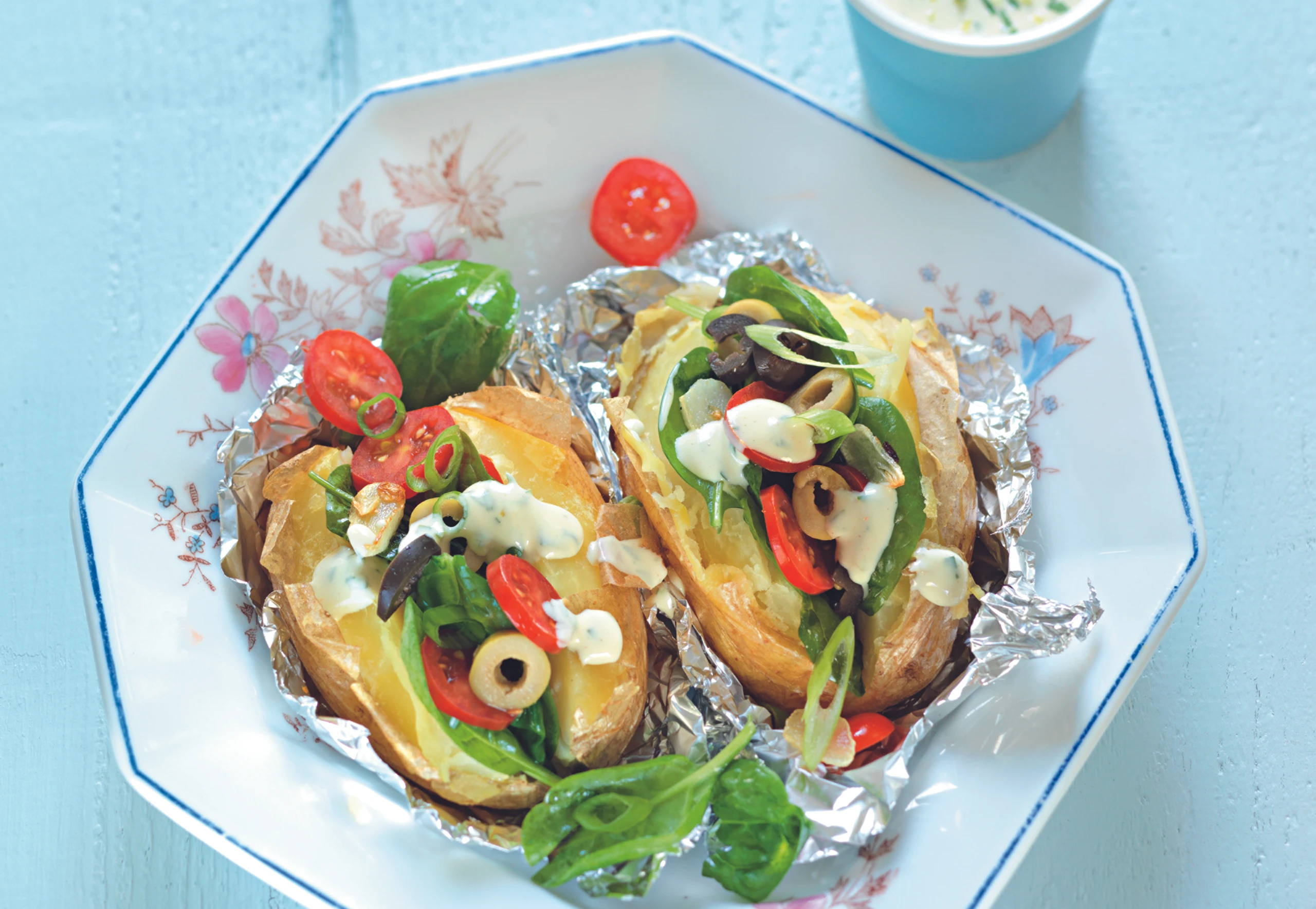 In einer Pfanne 3 EL Olivenöl erhitzen. Knoblauch darin unter Rühren anbraten. Spinat mit Knoblauch, Paradeisern, Jungzwiebeln und Oliven vermischen, mit 1 EL Zitronensaft, Salz und Pfeffer abschmecken. Erdäpfel der Länge nach aufschneiden, mit der Spinat-Mischung füllen, mit dem Senf-Dip servieren.