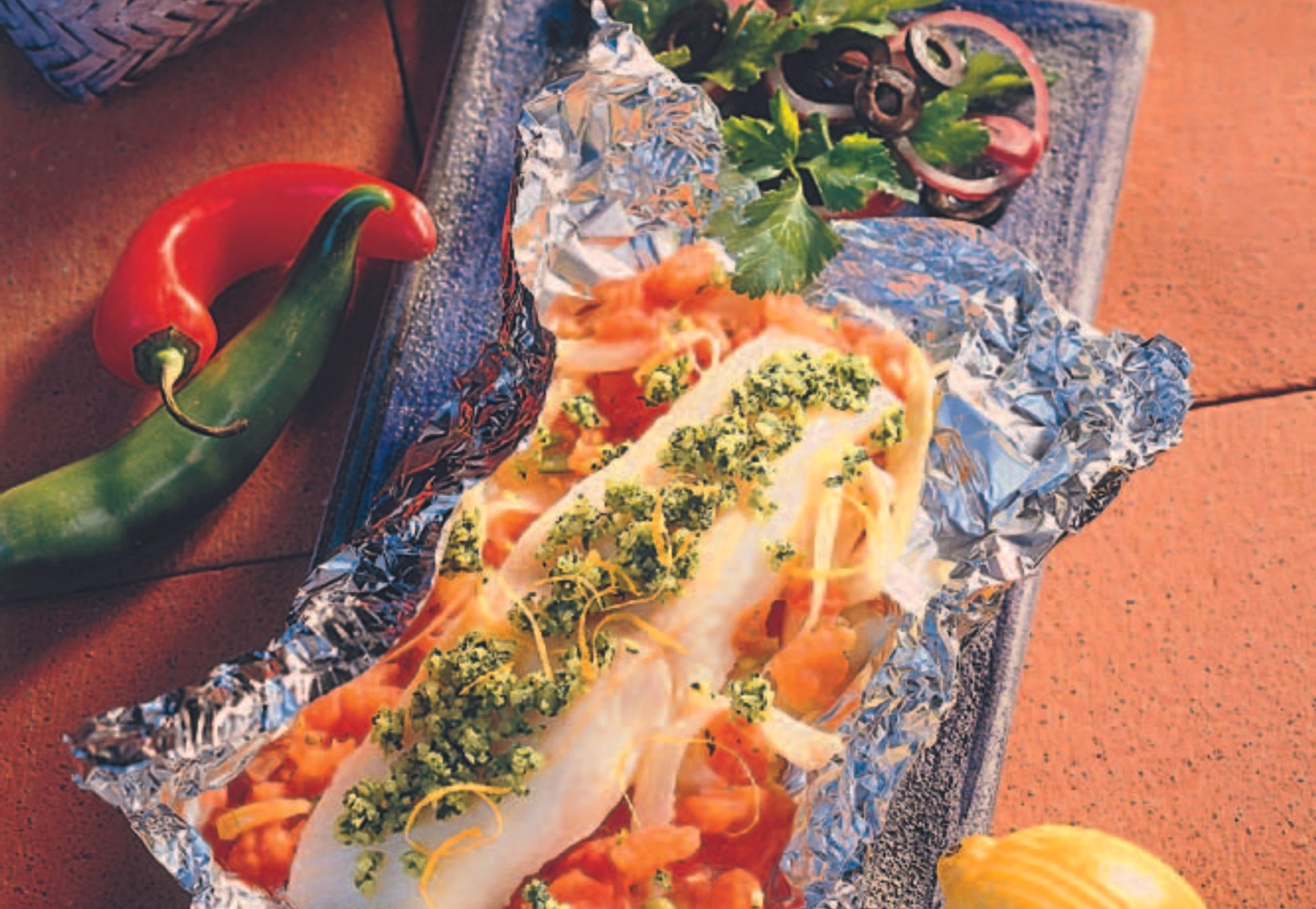 Aus Alufolie 4 Blätter (ca. 30 x 40 cm) zuschneiden. Sauce jeweils in der Mitte der Folie verteilen. Fischfilets salzen, pfeffern und auf die Sauce legen. Folie über dem Fisch gut verschließen. Fisch 10–12 Minuten im vorgeheizten Rohr (mittlere Schiene / Gitterrost) garen.