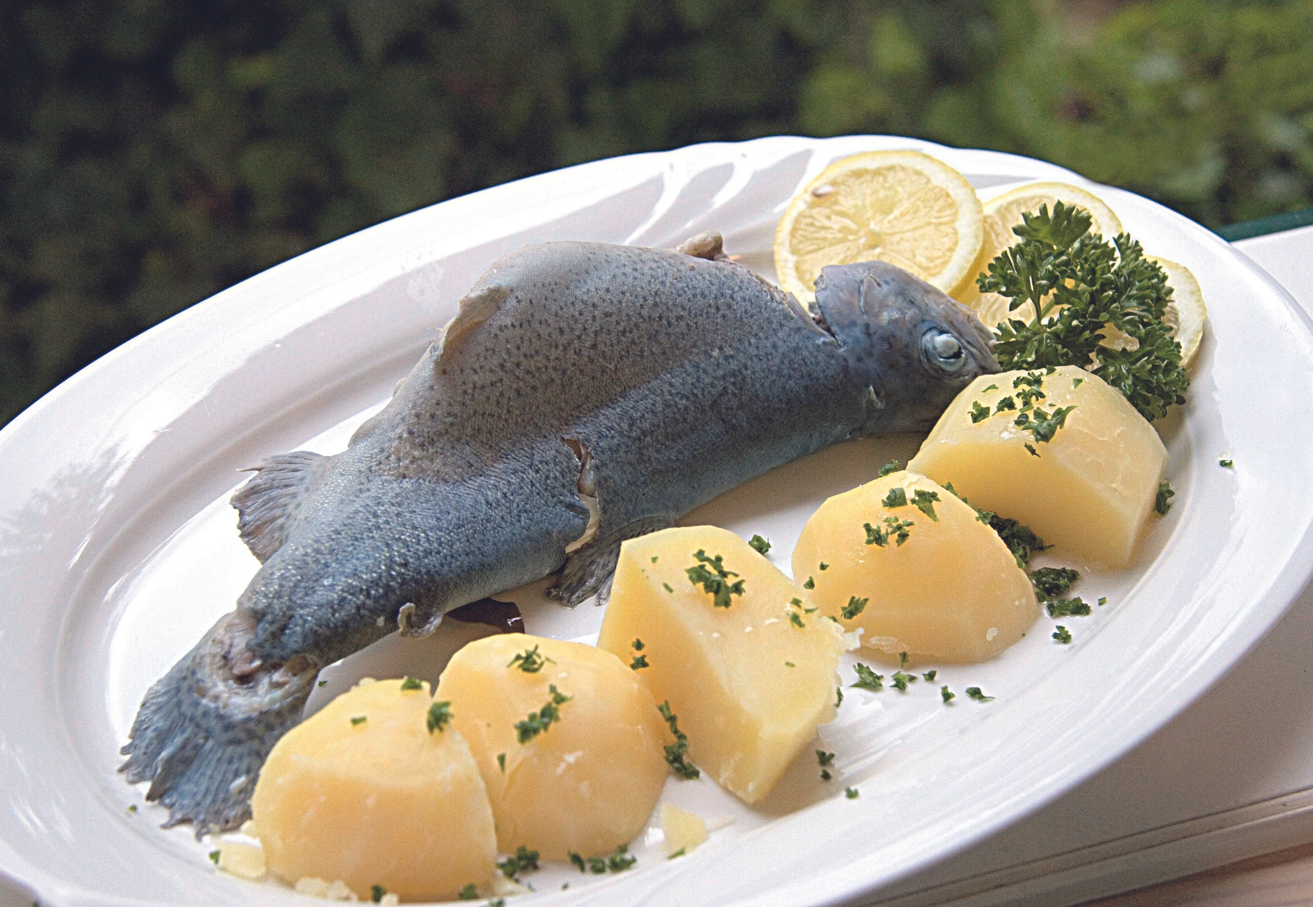 Forellen vorsichtig waschen, in den Sud legen und zugedeckt 15 Minuten ziehen lassen. Mit Petersilerdäpfeln, zerlassener Butter und grünem Salat servieren.