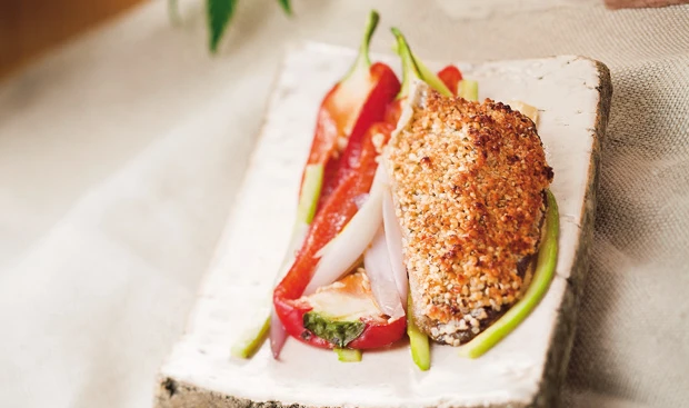 - Butter mit Hanf mischen. Forellenfilets salzen und pfeffern, in 2 EL Öl auf der Hautseite knusprig braten. Filets auf der Fleischseite mit der Masse bestreichen und bei maximaler Oberhitze knusprig überbacken. Mit dem Paprikagemüse anrichten.