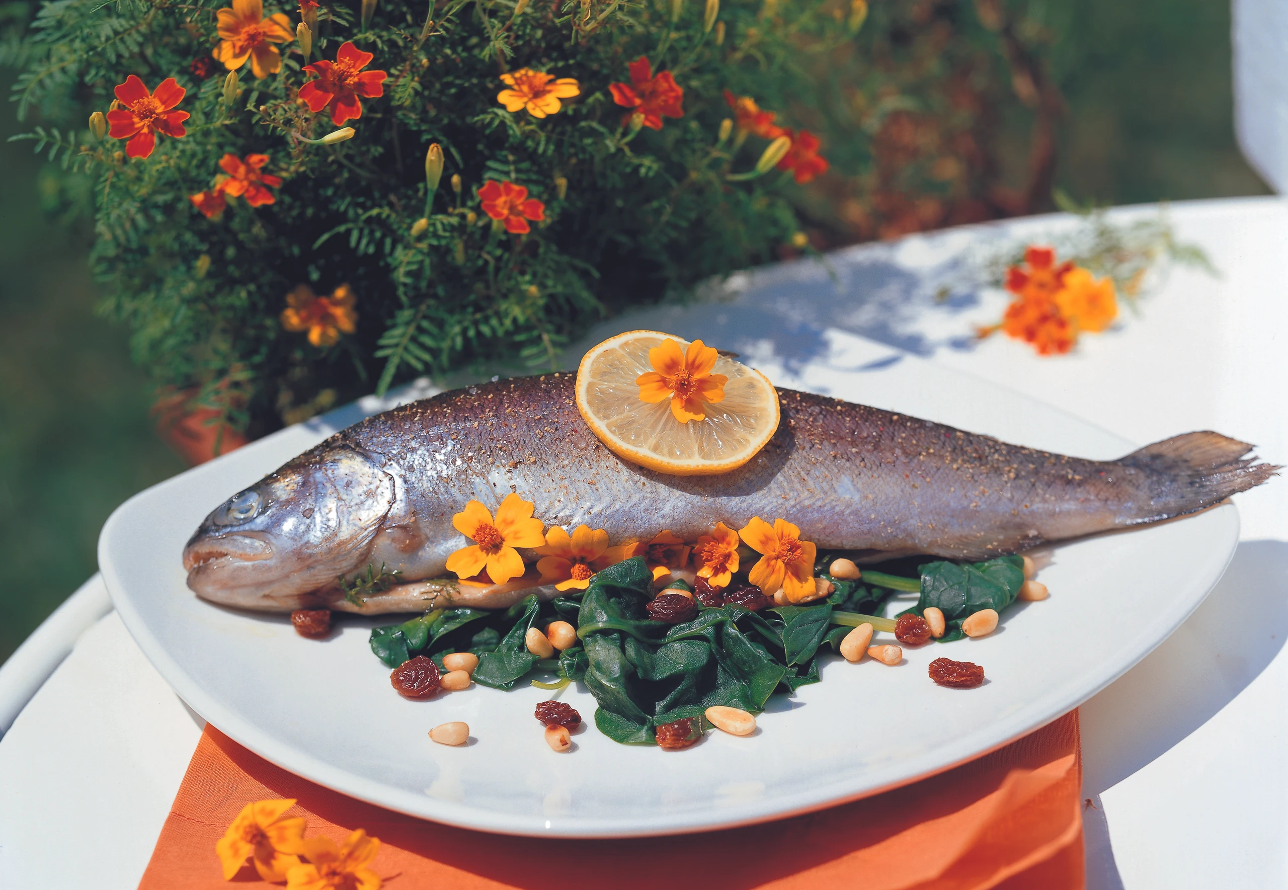 Forelle mit Orangentagetes auf Blattspinat