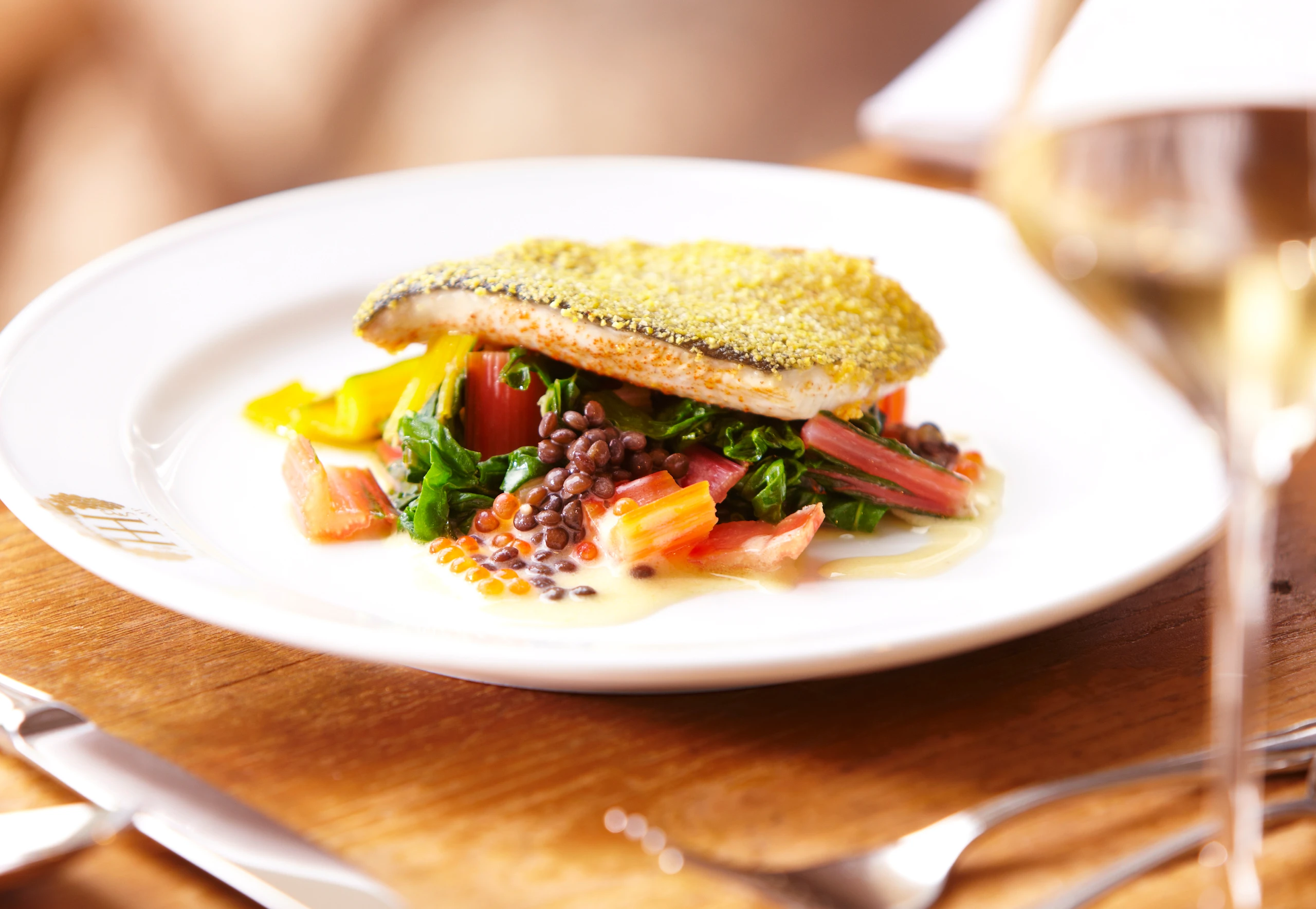 Linsen in der Fischbutter erwärmen. Kaviar untermischen. Fischfilets mit Mangold und Sauce anrichten.