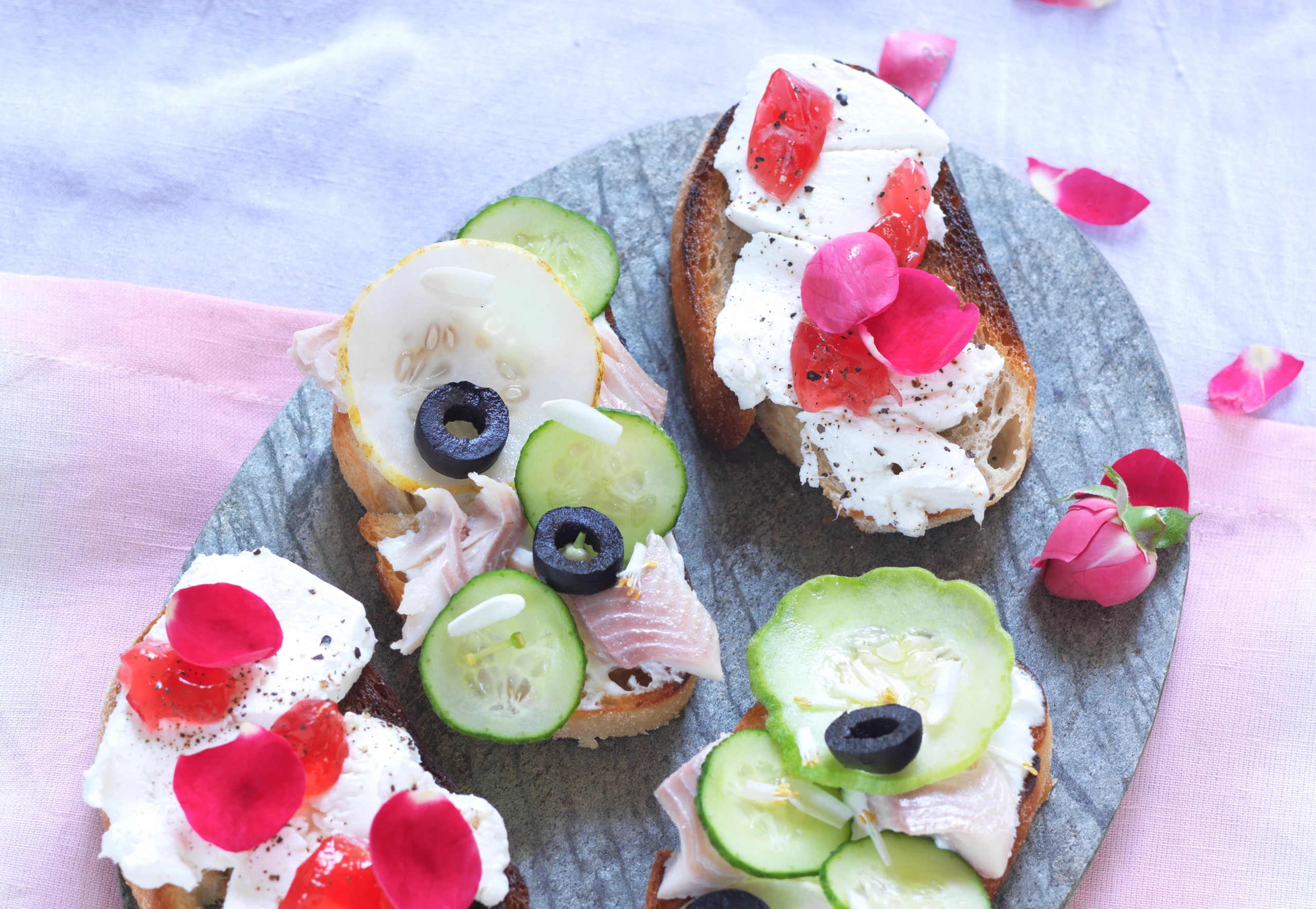 - Zitronenblüten fein schneiden, mit Joghurt verrühren, mit Salz und Cayenne würzen. Brote toasten, mit Blütencreme bestreichen, mit Forellenstücken, Gurke und Oliven garnieren.