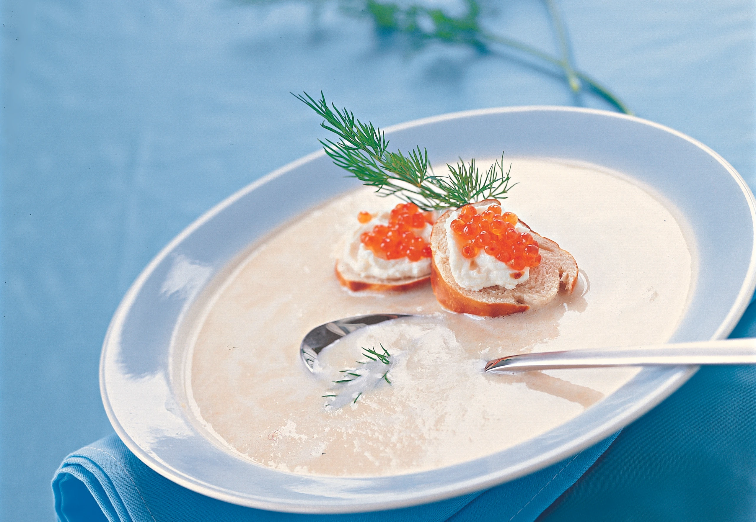 Laugenstangerl in 1 cm dicke Scheiben schneiden, mit Topfen bestreichen und mit Kaviar belegen. Suppe in Teller gießen, die Kaviarbrötchen als Einlage servieren, mit Dille garnieren.