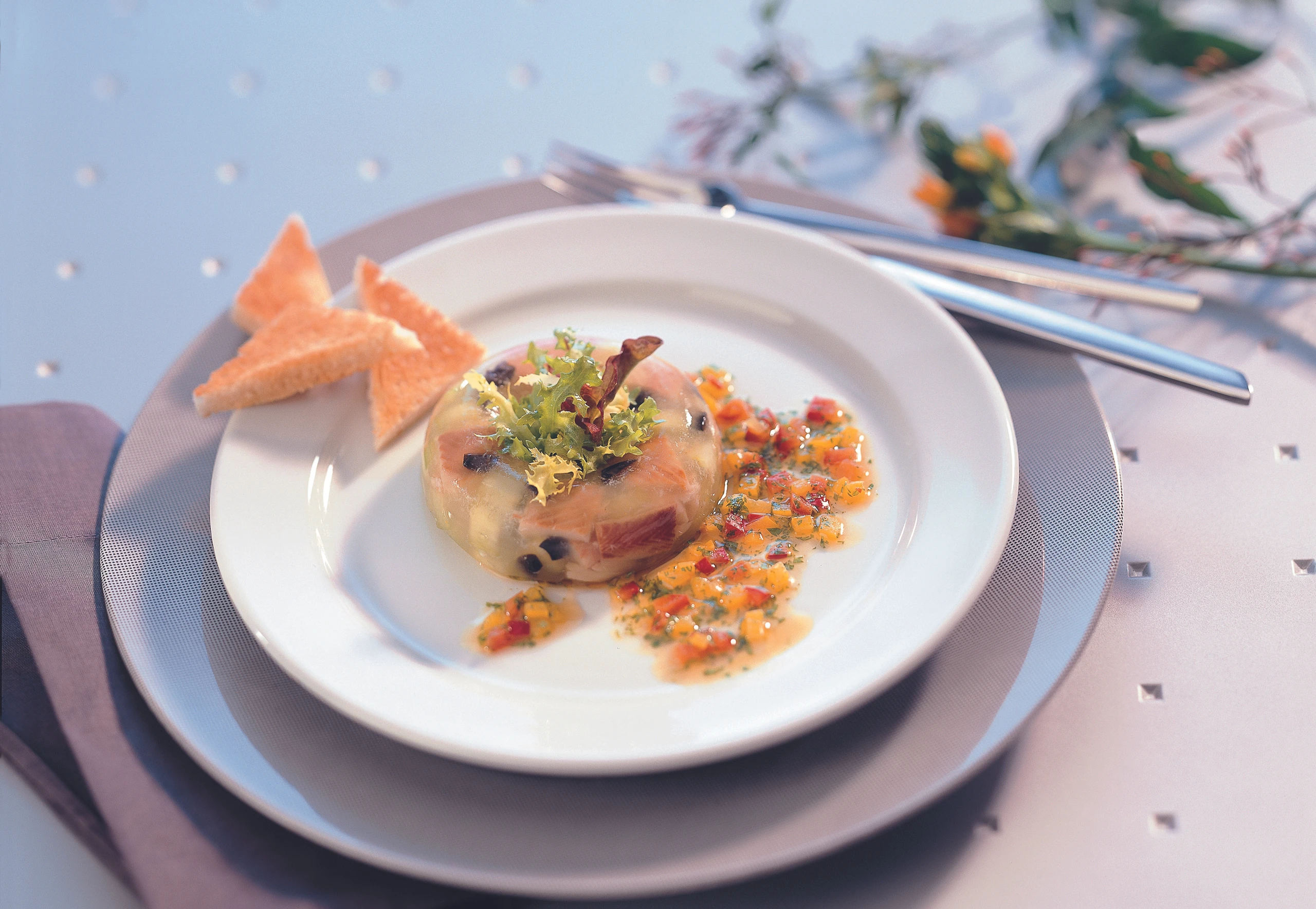 Zum Anrichten Förmchen kurz in heißes Wasser tauchen, Sülzchen auf gekühlte Teller stürzen, mit Paprika-Vinaigrette, Salat und Brotecken servieren.