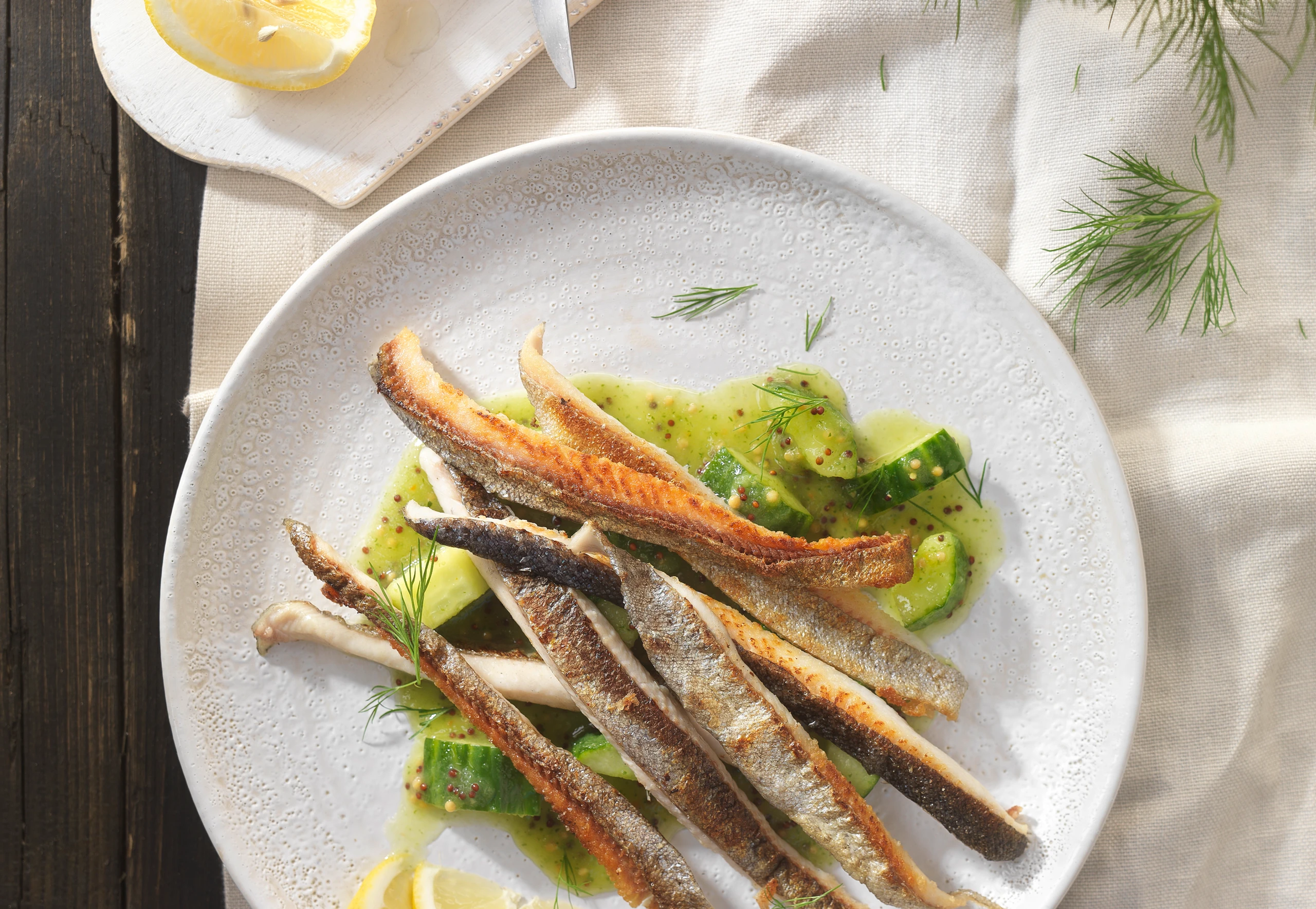 Fischfilets längs vierteln, mit Salz und Pfeffer würzen. In einer Pfanne Olivenöl erhitzen, Fischstreifen mit der Hautseite nach unten einlegen und knusprig anbraten (ca. 1 Minute), wenden und kurz fertig braten. Fischstreifen mit der Sauce anrichten und mit Dille und eventuell Zitronenspalten garniert servieren.