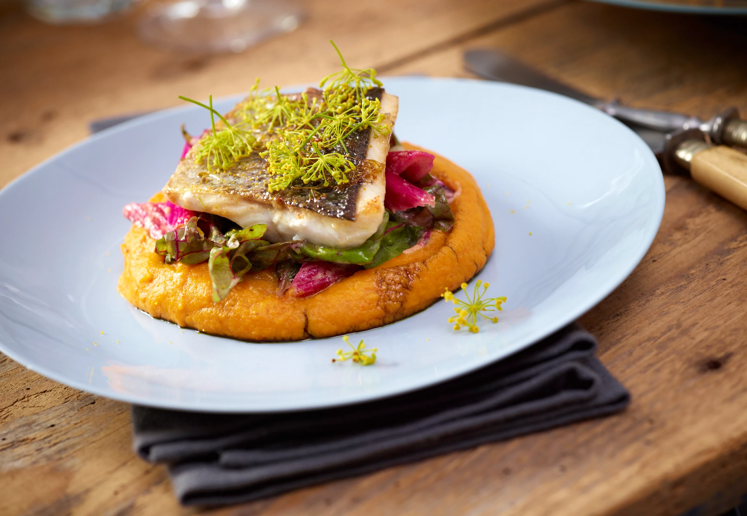 Forellenfilets salzen, pfeffern und mit der Hälfte von den Dillblüten bestreuen. 3 EL Olivenöl und 1 EL Butter erhitzen, Filets mit der Hautseite nach unten einlegen und glasig braten (ca. 6 Minuten). Filets wenden und kurz fertig braten. Mangoldblätter in den Senffond geben und kurz ziehen lassen. Filets mit Püree und Mangold anrichten, mit den übrigen Dillblüten bestreut servieren.