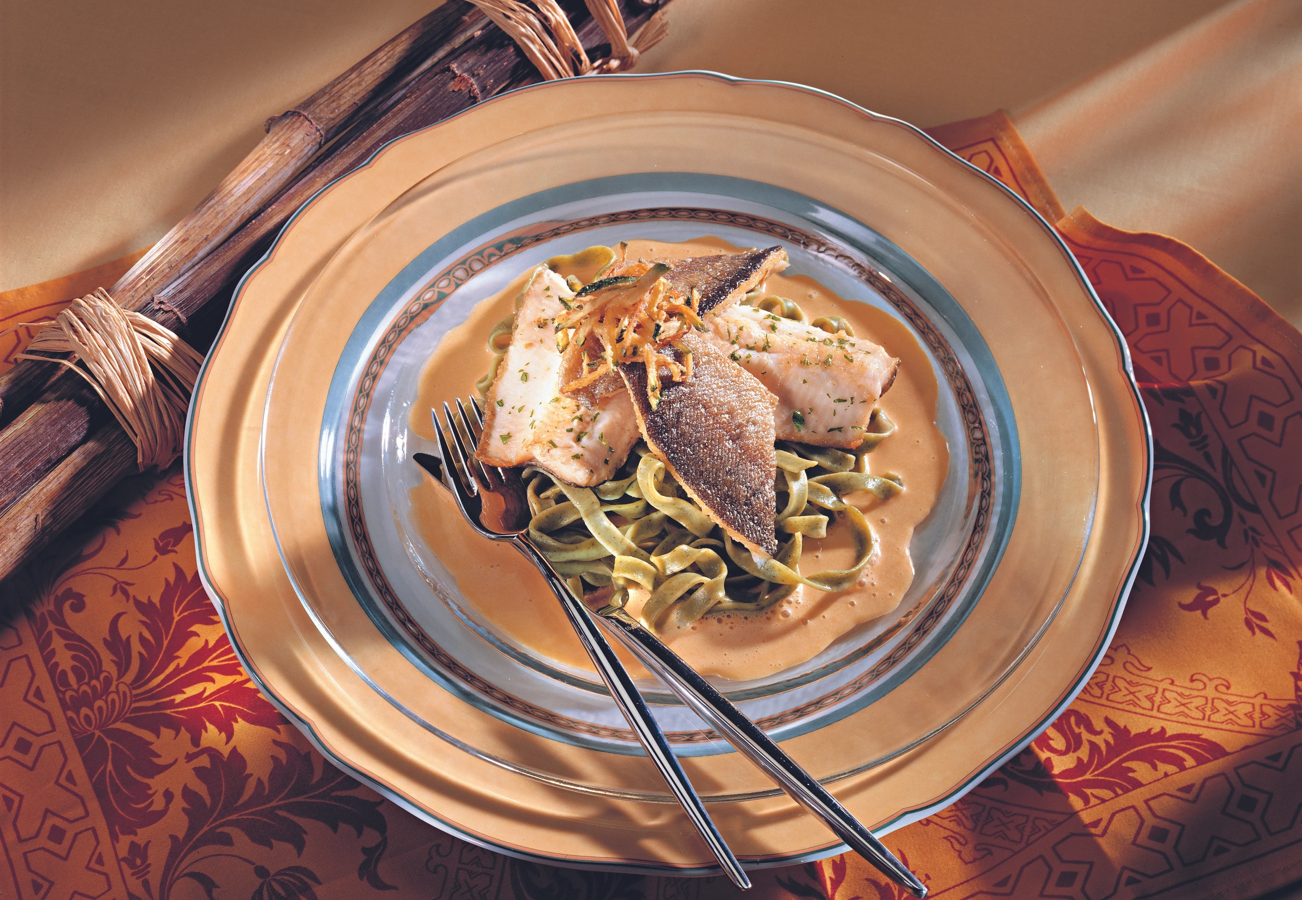 Bratrückstand mit Obers und Karottensaft aufgießen und auf kleiner Flamme ca. 1 Minute köcheln. Stärkemehl mit 1 TL Wasser glattrühren, in die Sauce gießen und kurz aufkochen. Sauce mit einem Stabmixer aufschlagen. Fischfilets mit der Sauce sowie den Nudeln und Zucchinistreifen (siehe Rezepte) anrichten.