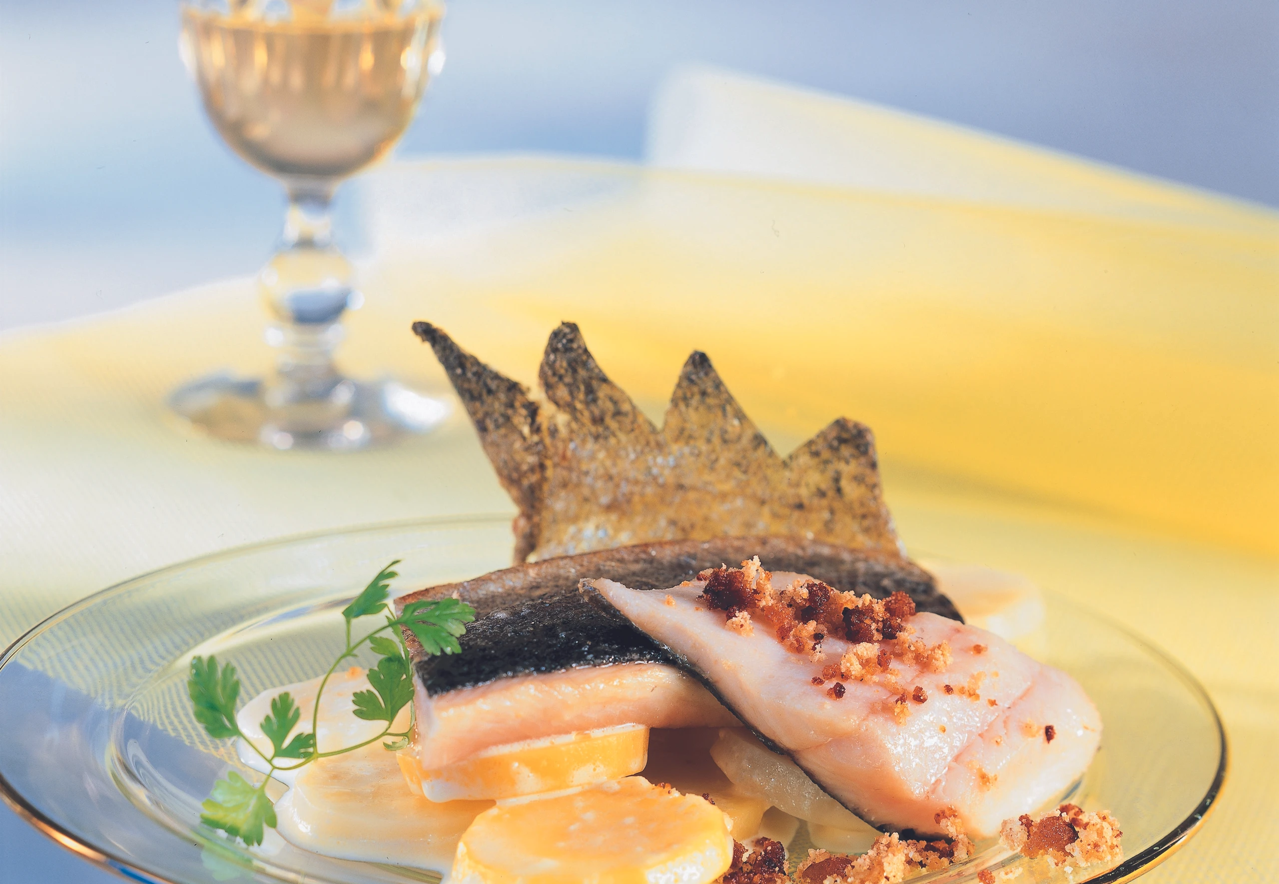 Fisch mit den Lebkuchenbröseln und dem Gemüse anrichten, mit den Kräuterzweigen und eventuell mit der knusprigen Haut garnieren.