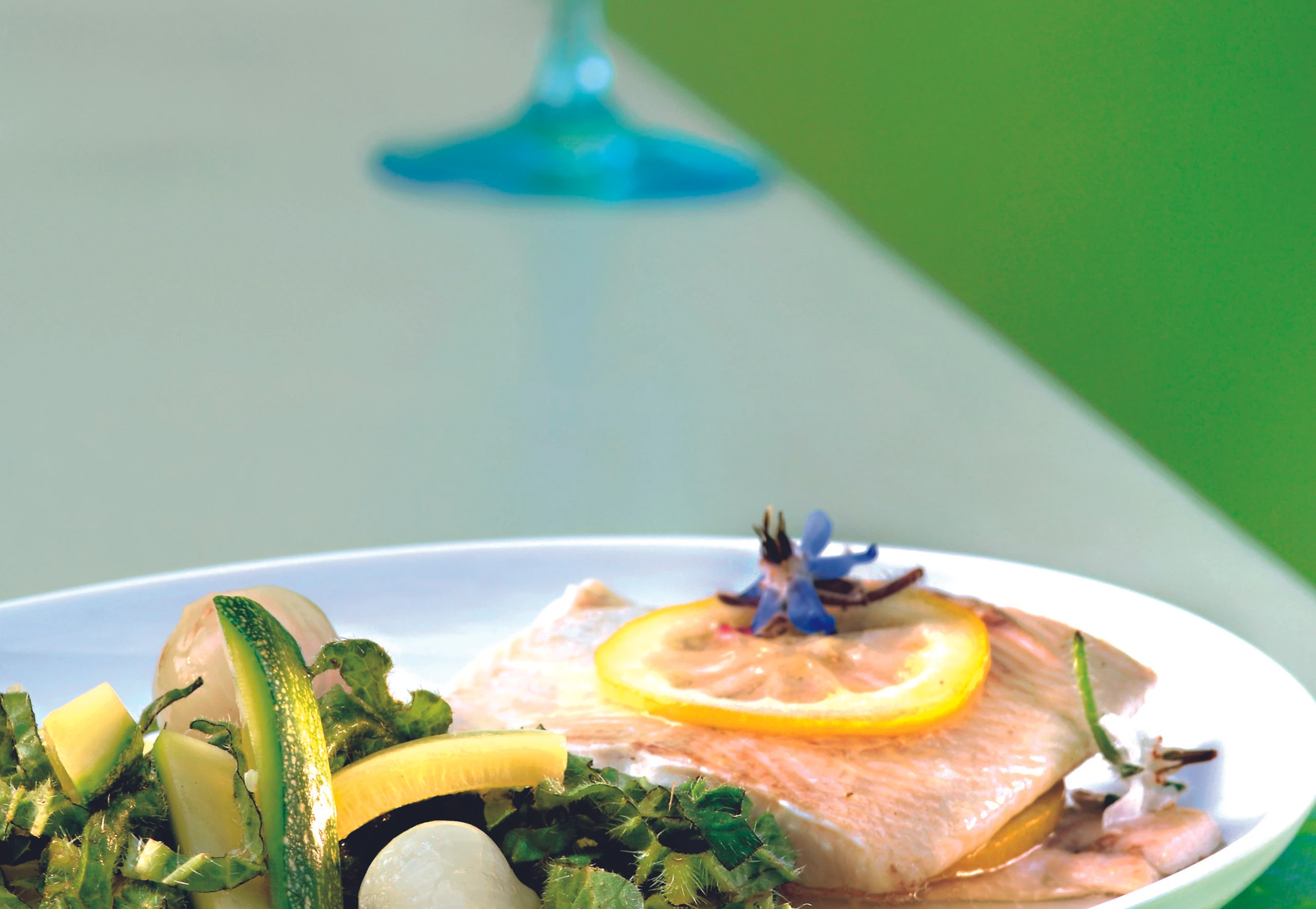 Forellenfilets mit Zitronenscheiben und Gemüse anrichten. Eventuell mit Borretschblüten garnieren.