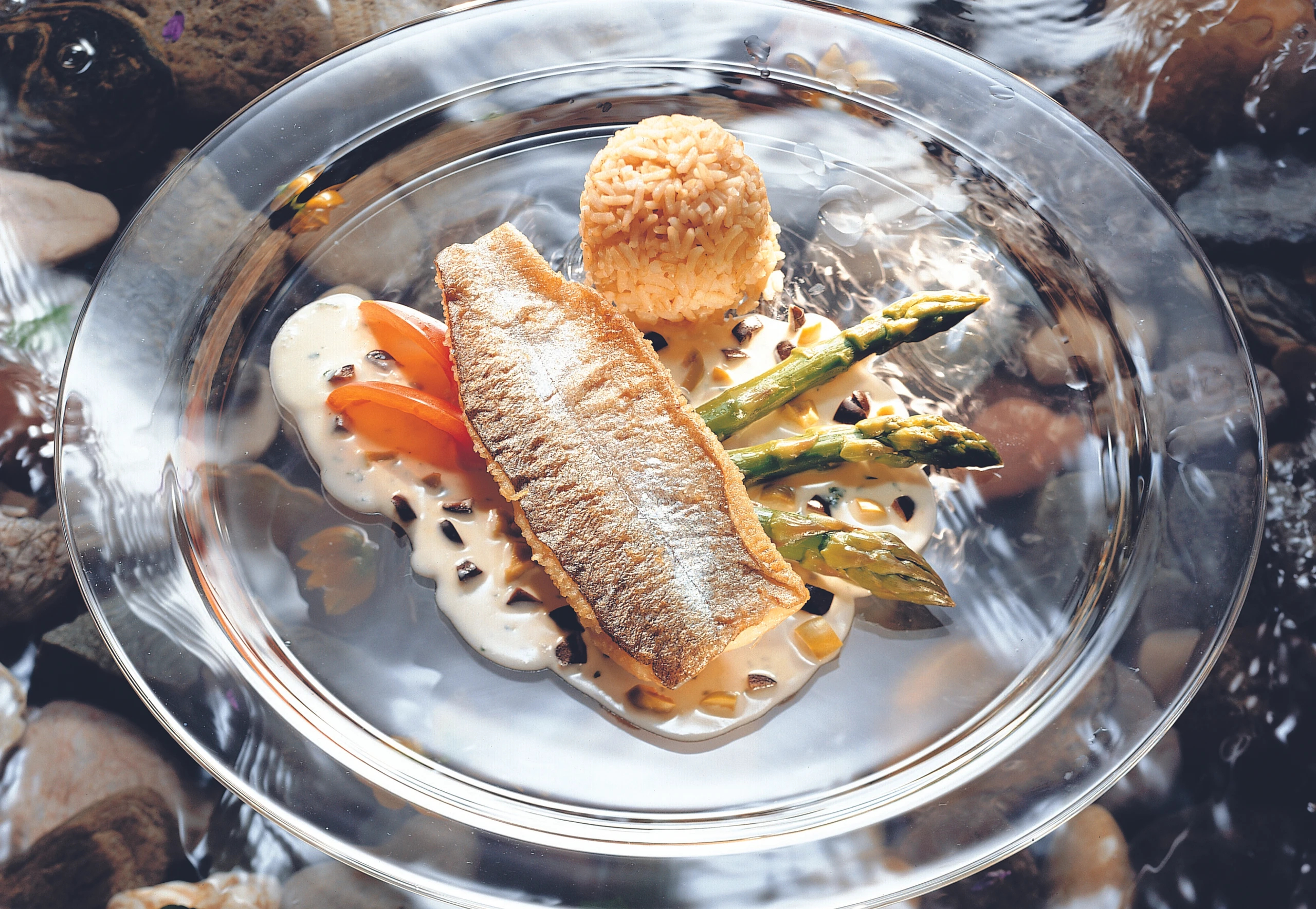 Im Bratrückstand Zwiebel und Oliven anschwitzen, mit Wermut und Suppe aufgießen und Flüssigkeit auf die Hälfte einkochen. Obers zugießen und cremig einkochen. Sauce vom Feuer nehmen, Petersilie untermischen. Forellenfilets mit der Sauce, Spargelgemüse und Naturreis anrichten.