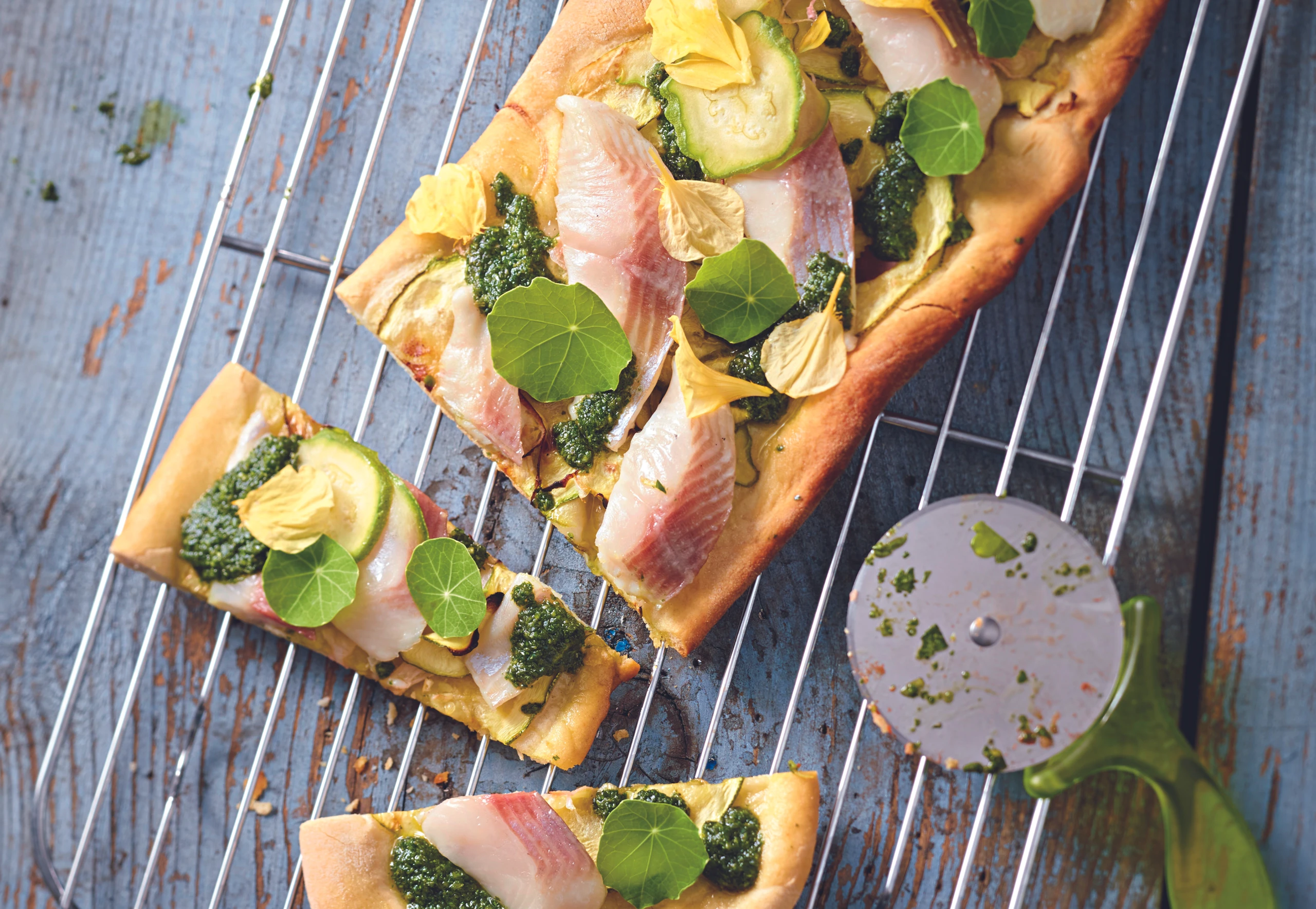 Forellenfilets salzen und quer in ca. 3 cm breite Stücke schneiden. Pizza herausnehmen, mit Forellenstücken belegen und fertig backen (ca. 4 Minuten). Übrige Pizzen ebenso backen. Pizzen mit Pesto beträufeln, mit Kapuzinerkresse garnieren.