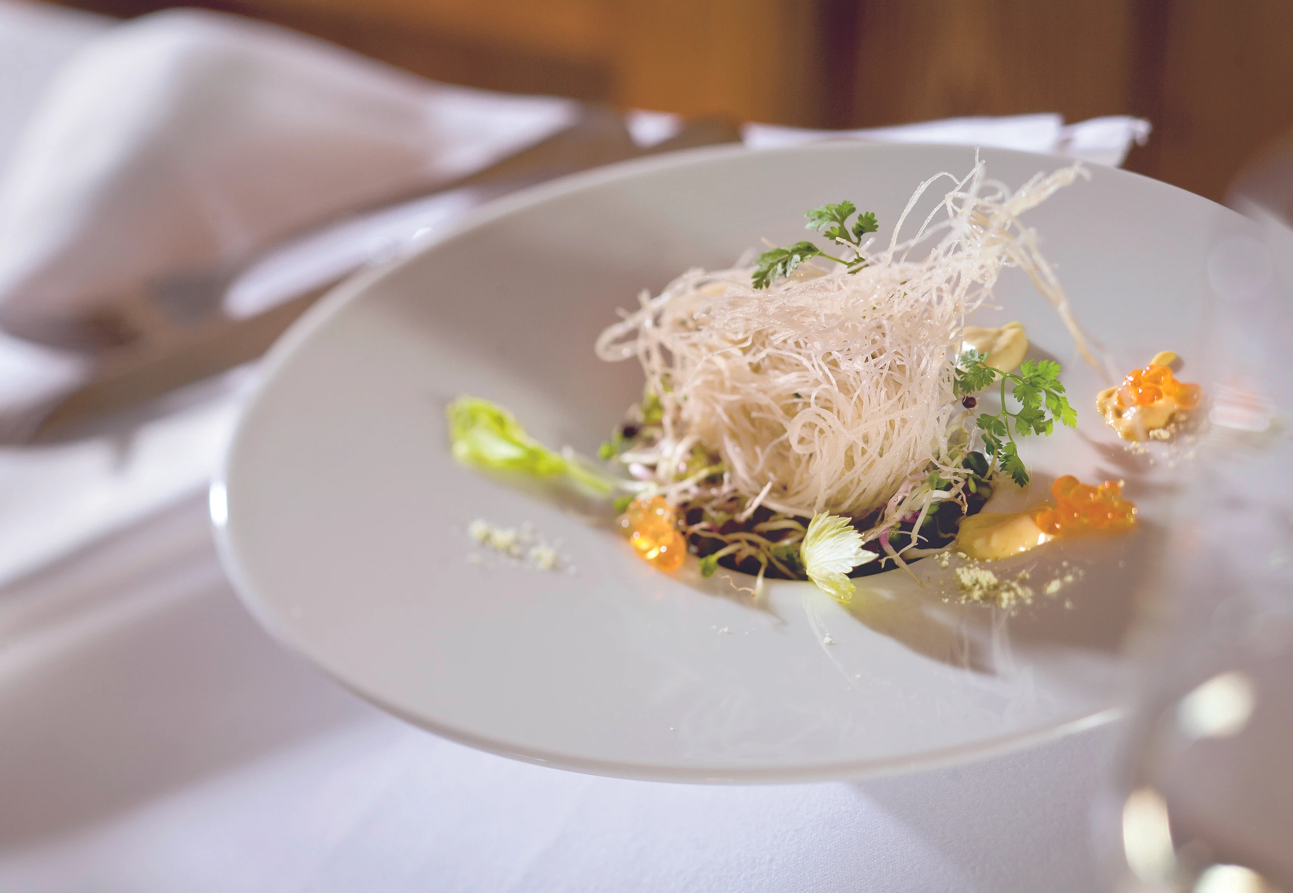 Gut gekühlte Forellenfilets in 3 mm große Stücke schneiden, salzen, pfeffern, mit Eiklar, Senf, Kren, Schnittlauch, Dille und Bröseln vermischen. Masse mit Frischhaltefolie zudecken und kurz kühl stellen.