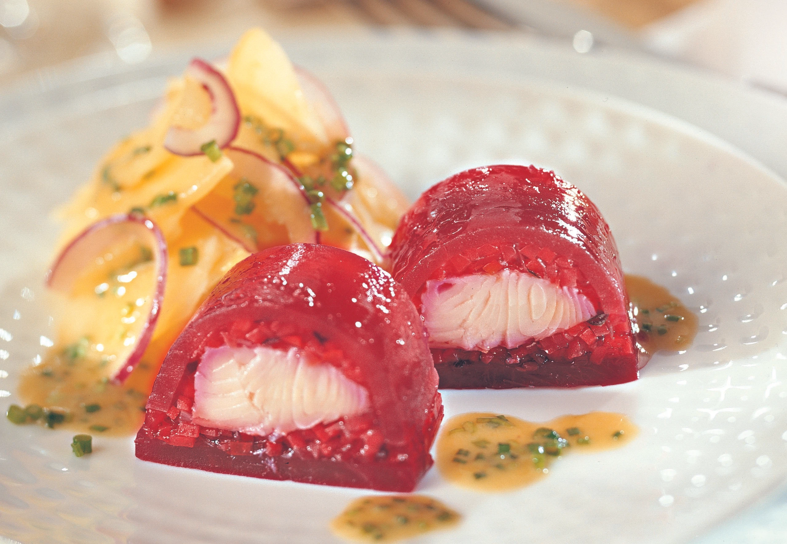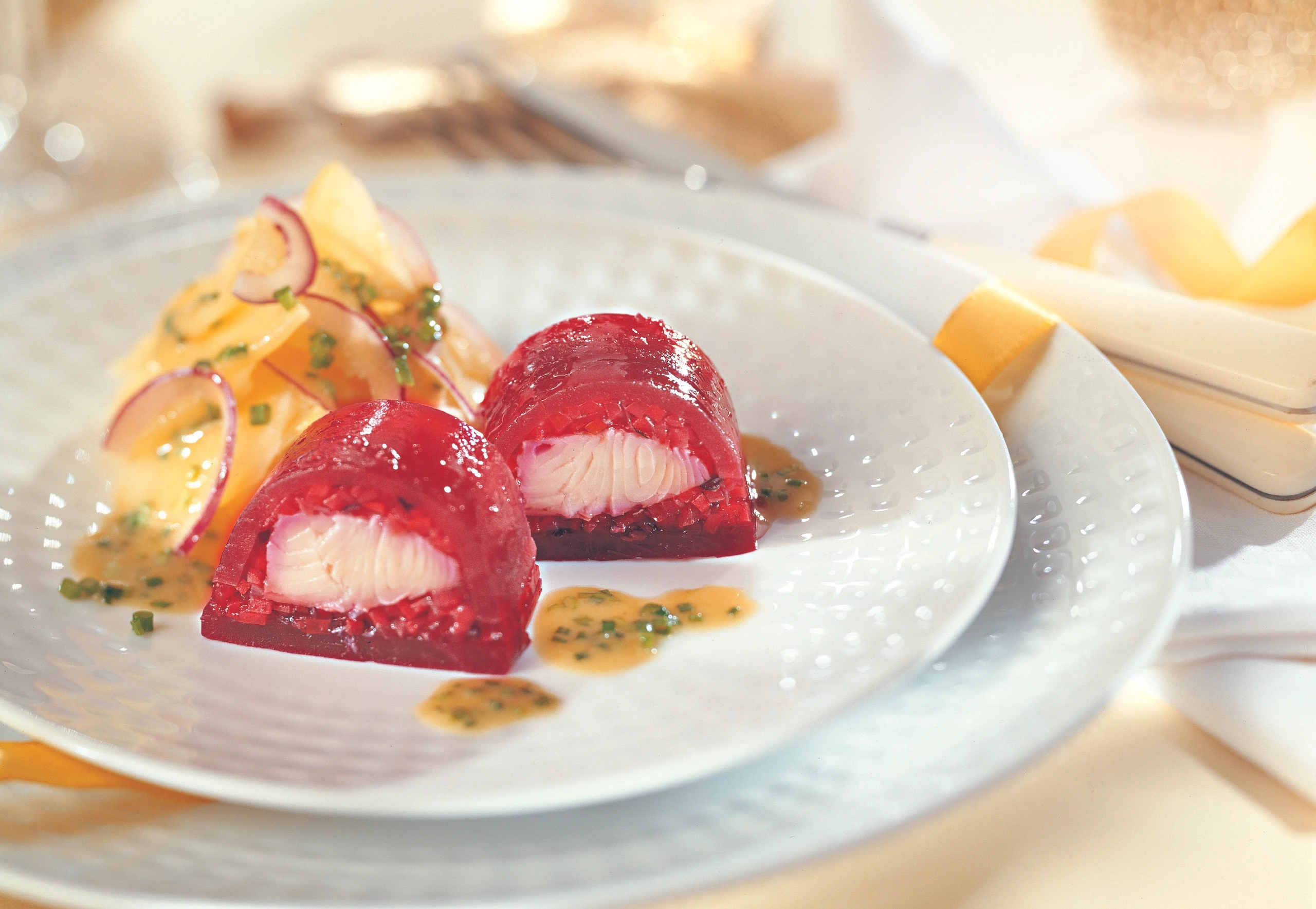 Jungzwiebel putzen und fein schneiden. Karotte und Gelbe Rübe schälen und in ganz kleine Würfel schneiden. Gemüse 2 Minuten im Fischfond kochen, herausnehmen und kalt abschrecken. Fond auf 150 ml einkochen. Gelatine im heißen Fond auflösen. Fond mit Salz abschmecken und abkühlen lassen.