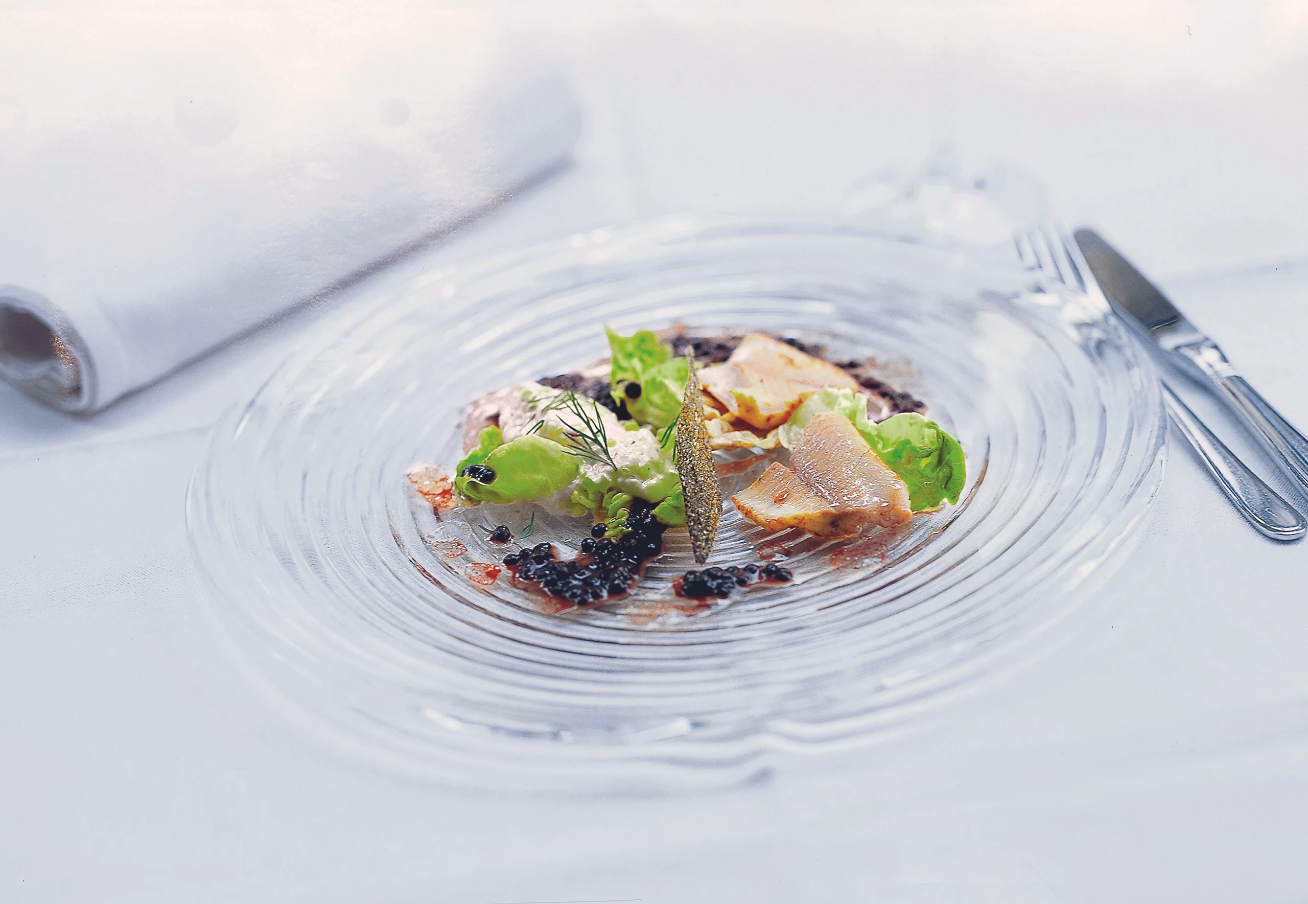 Tatar aus dem Kühlschrank nehmen und bei Bedarf nachwürzen. Salatherzen mit der Vinaigrette marinieren und auf Tellern anrichten. Mit 2 Löffeln schöne Nocken vom Tatar abstechen und auf die Salatherzen legen. Mit den lauwarm marinierten Linsen anrichten und mit Schnittlauch garnieren. Hannes Hell hat das Gericht zusätzlich mit zart gegartem Forellenfilet und knusprig gebratener Haut angerichtet.