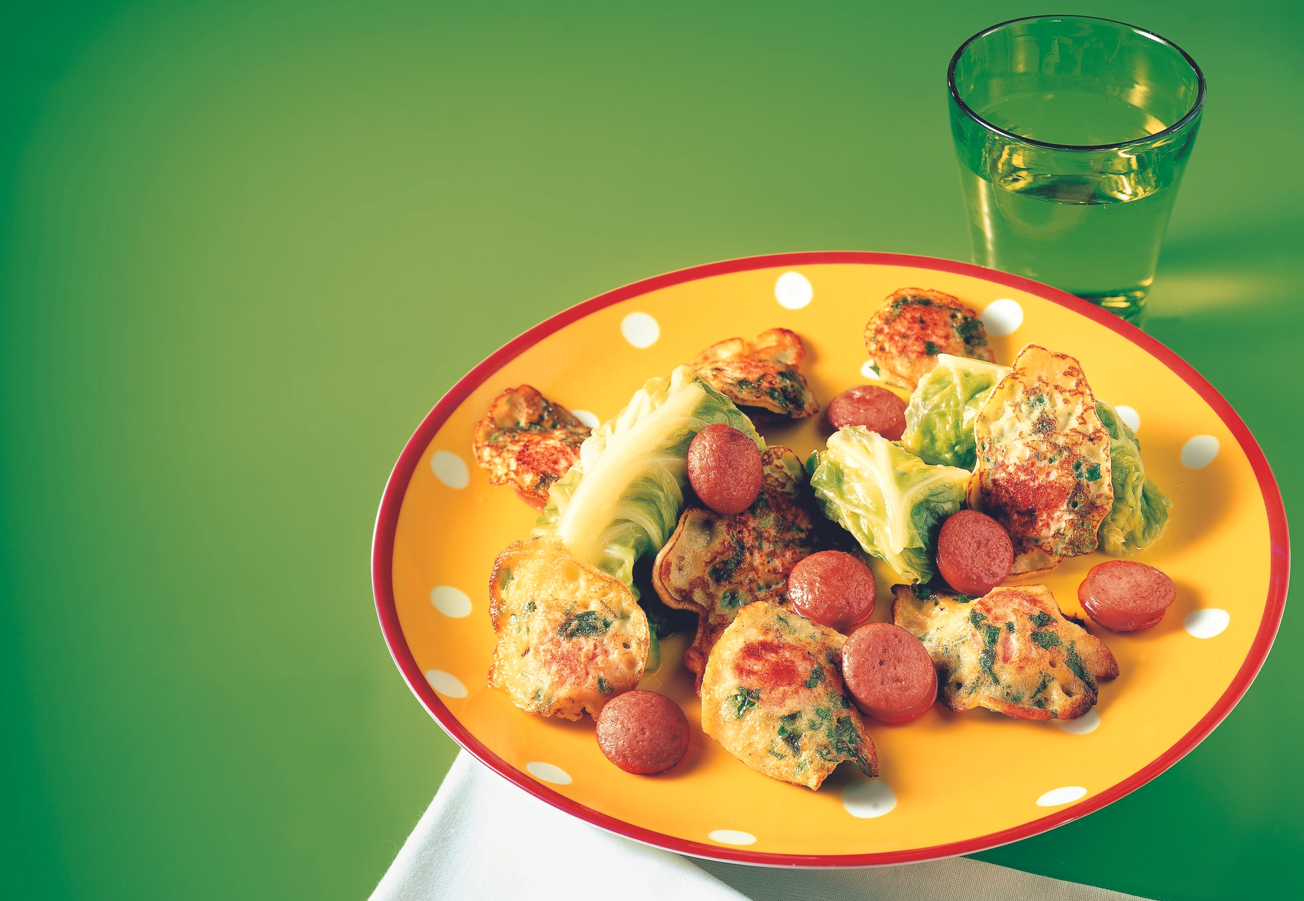 Würstel in dünne Scheiben schneiden, zwei Drittel davon unter den Teig mischen – die übrigen Scheiben werden extra gebraten.