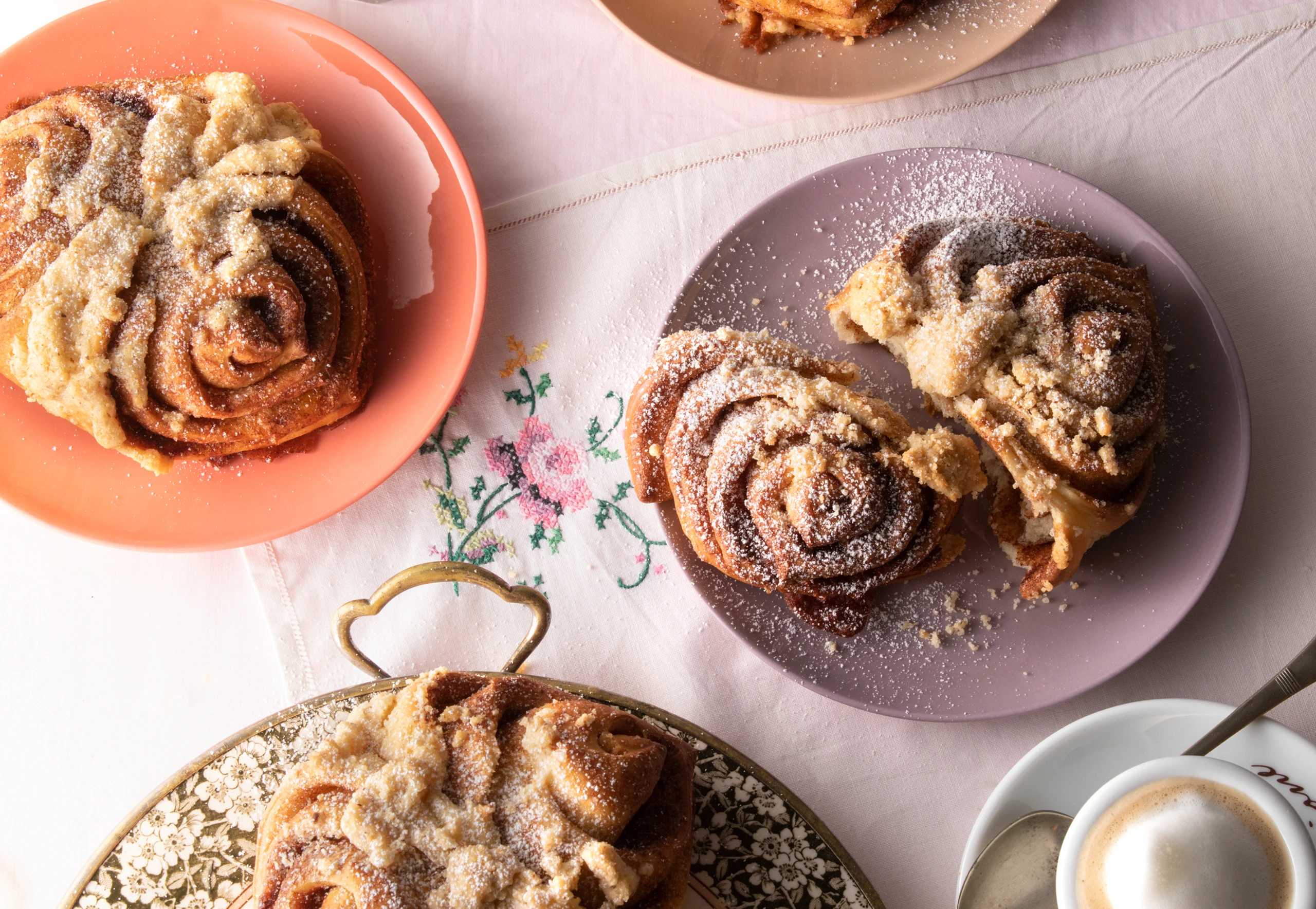 Teig eng von unten nach oben einrollen und in 8 trapezförmige Stücke schneiden. Teigstücke aufstellen und auf der schmalen Seite mit einem Kochlöffelstiel eindrücken. Franzbrötchen auf das Blech legen, mit zerlassener Butter bestreichen und die Streusel darauf verteilen. Im Rohr (mittlere Schiene) ca. 20 Minuten goldbraun backen. Herausnehmen, mit Staubzucker bestreuen und noch warm genießen.