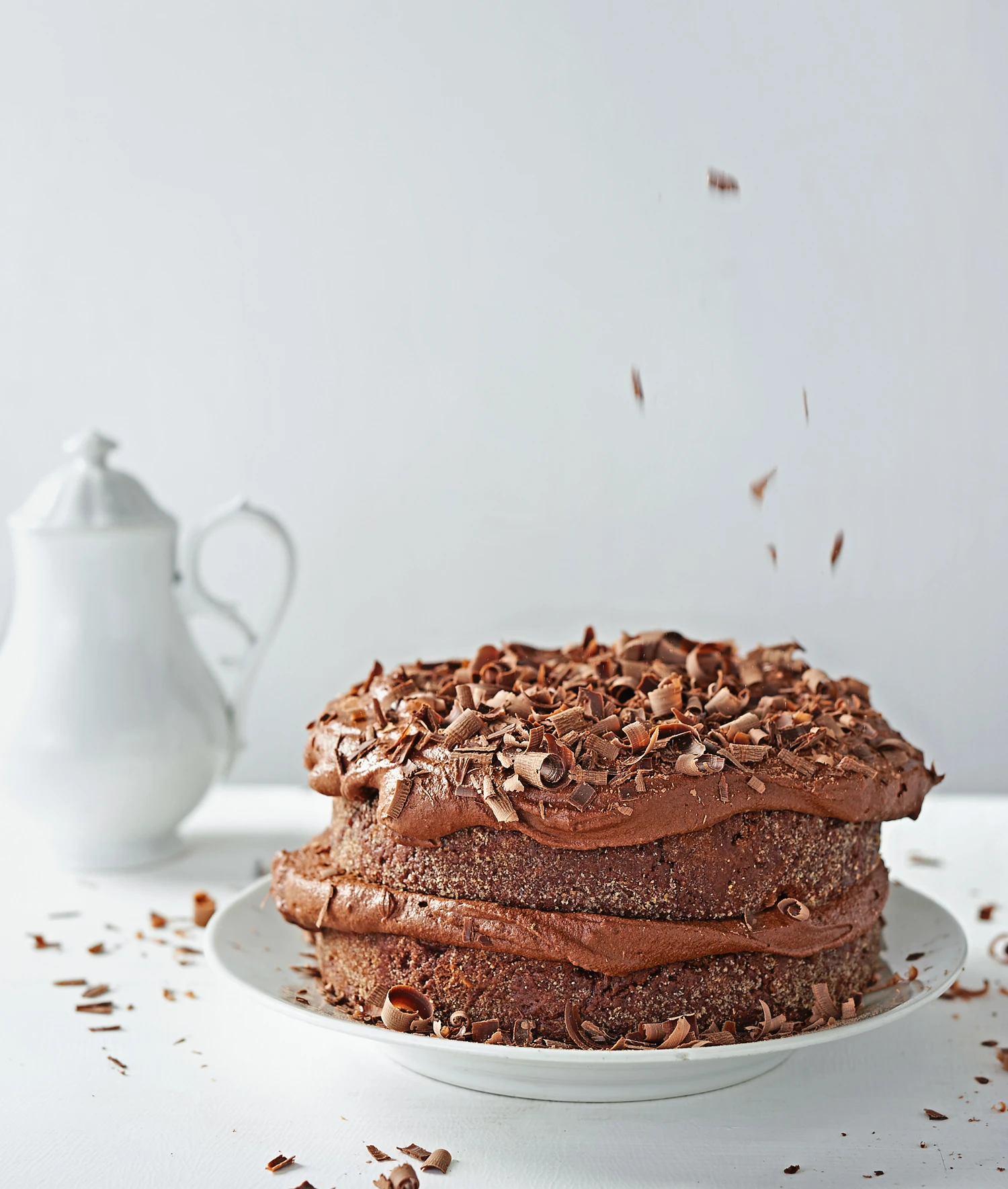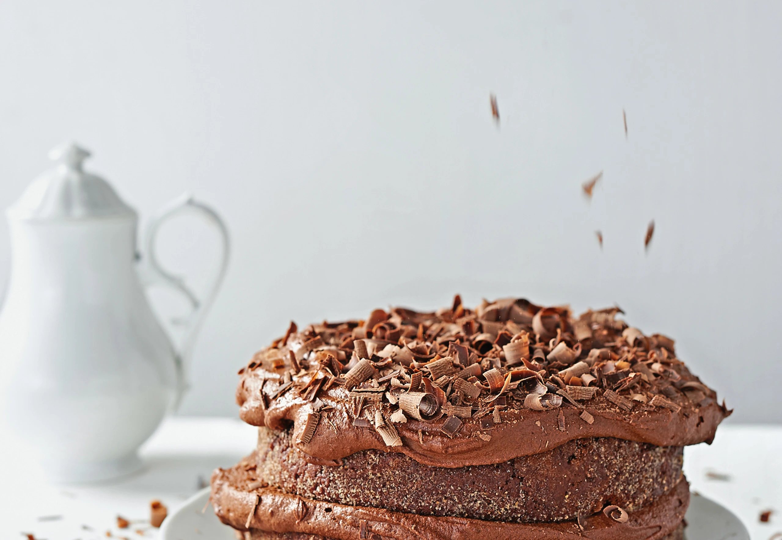 - Für das Frosting Margarine, Zucker und Kakao ca. 3 Minuten cremig mixen. Kuvertüre und Joghurt unterrühren. Die Hälfte vom Frosting auf einem Tortenboden verstreichen. Zweiten Boden darauf legen und leicht andrücken. Übriges Frosting darauf verstreichen. Mit Schokoraspel bestreuen. Torte für mind. 3 Stunden kalt stellen.