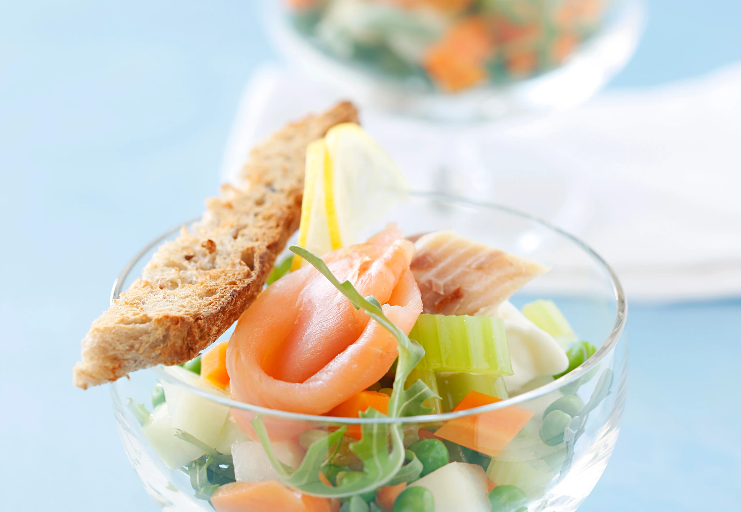 - Für die Mayonnaise Ei, Senf, Salz, Pfeffer und Zitronensaft in einem hohen Gefäß mit dem Mixstab pürieren, Öl in dünnem Strahl einfließen lassen, bis eine homogene Masse entsteht. Mayonnaise und Joghurt vermischen, Gemüse und Rucola untermengen. Salat mit Speck, Fisch und Brotchips anrichten, eventuell mit Zitronenscheiben garnieren.