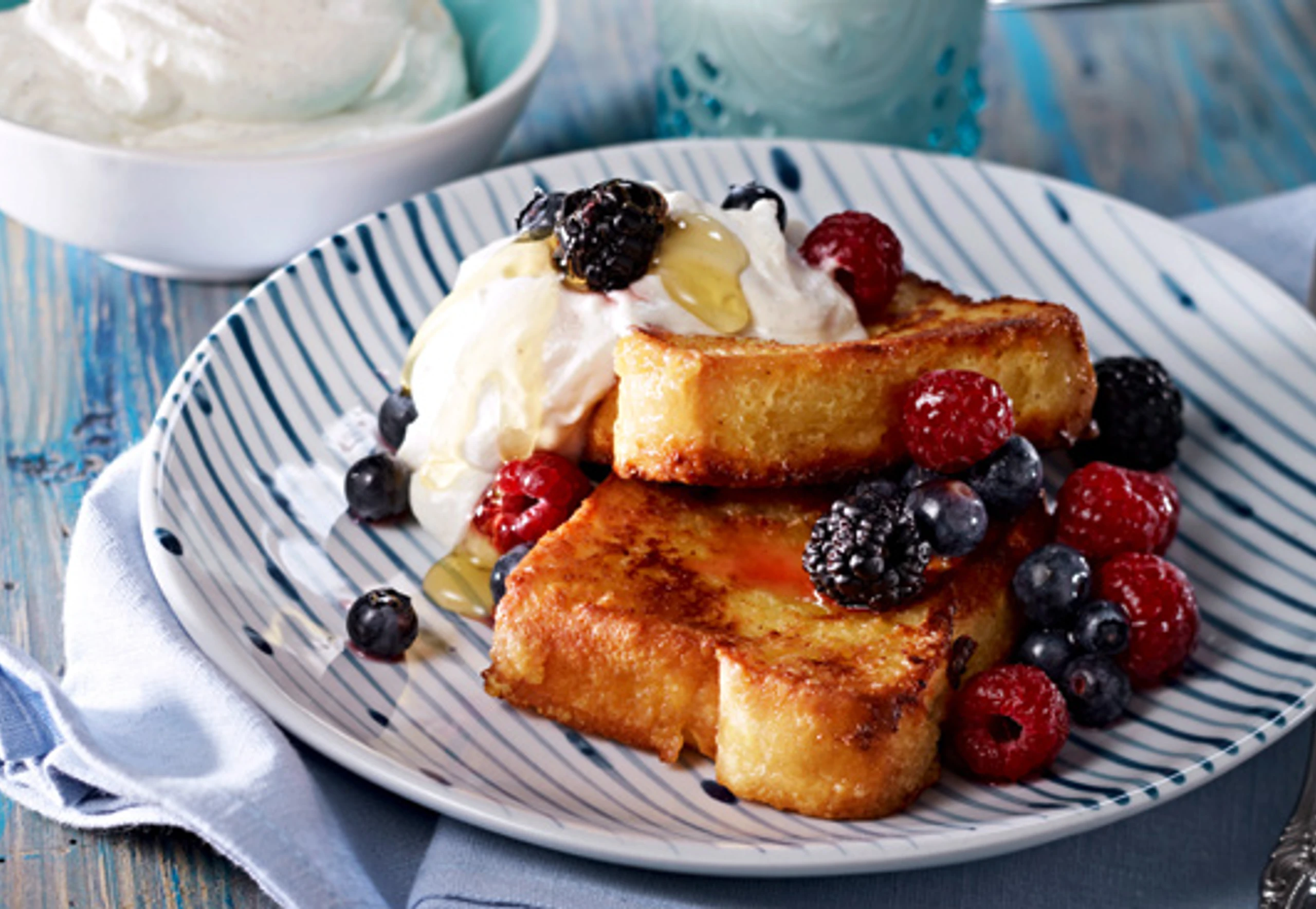 French Toast mit den Beeren belegen und mit der Creme servieren.
